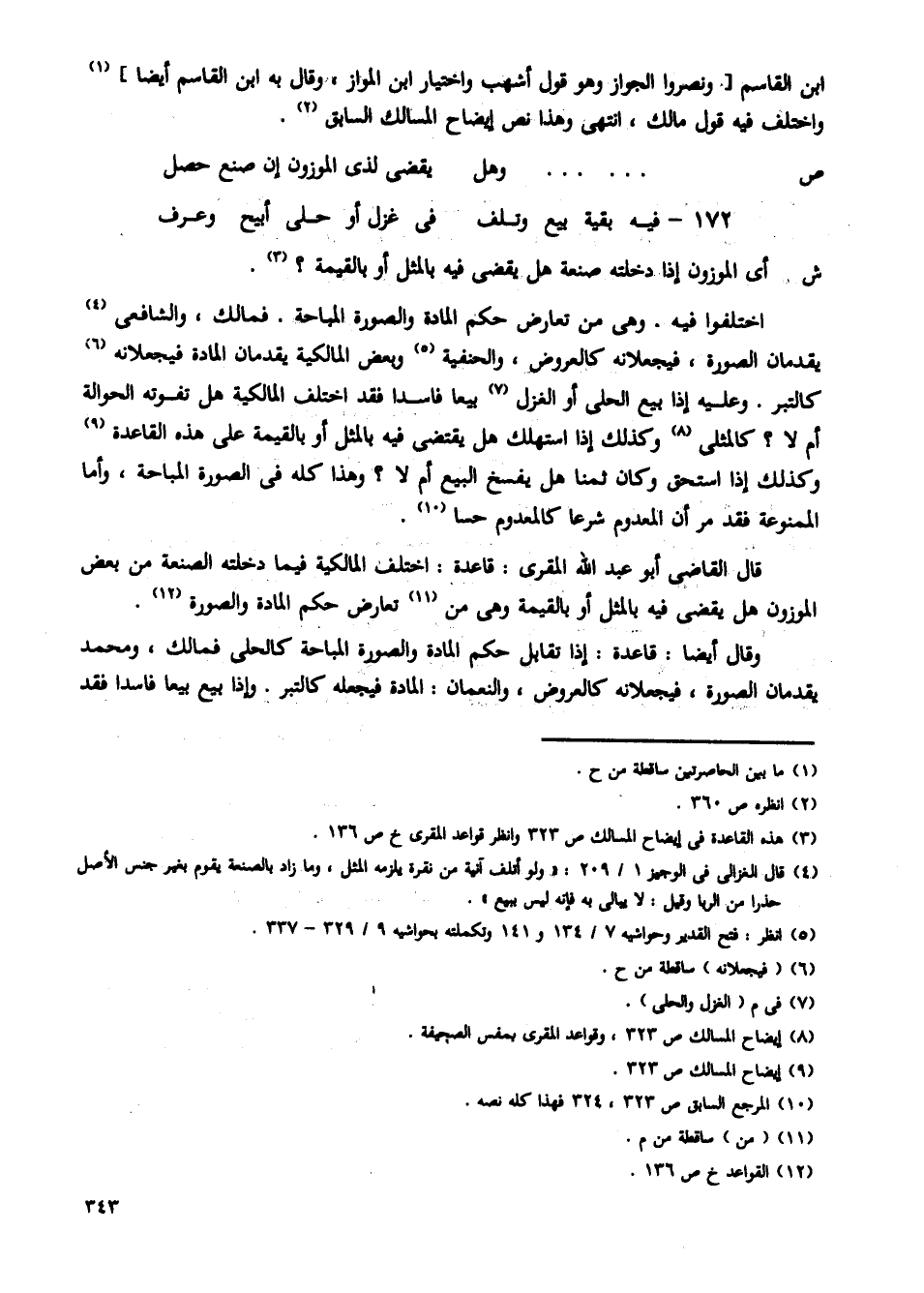 قال القاضى أبو عبد الله المقرى: قاعدة: اختلف المالكية فيما دخلته الصنعة من بعض الموزون هل يقضى فيه بالمثل أو القيمة وهى من تعارض حكم المادة والصورة.
