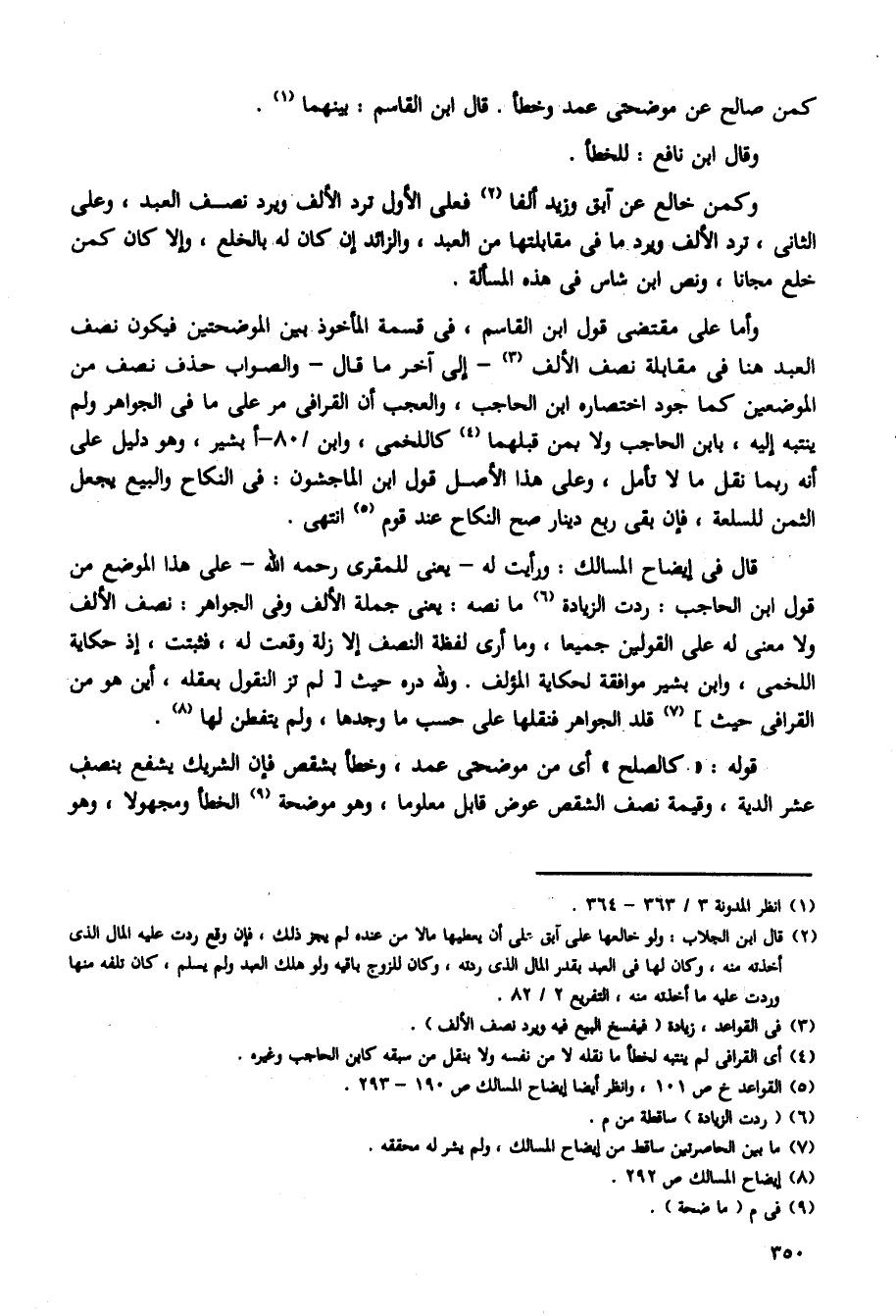 قال فى إيضاح المسالك: ورأيت له -يعنى للمقرى رحمه الله- على هذا الموضع من قول ابن الحاجب: ردت الزيادة ما نصه: يعنى جملة الألف وفى الجواهر: نصف الألف ولا معنى له على القولين جميعا، وما أرى لفظة النصف إلا زلة وقعت له، فثبتت، إذ حكاية اللخمى، وابن بشير موافقة لحكاية المؤلف. ولله دره حيث [لم تز النقول بعقله، أين هو من القرافى حيث] قلد الجواهر فنقلها على حسب ما وجدها، ولم يتفطن لها.