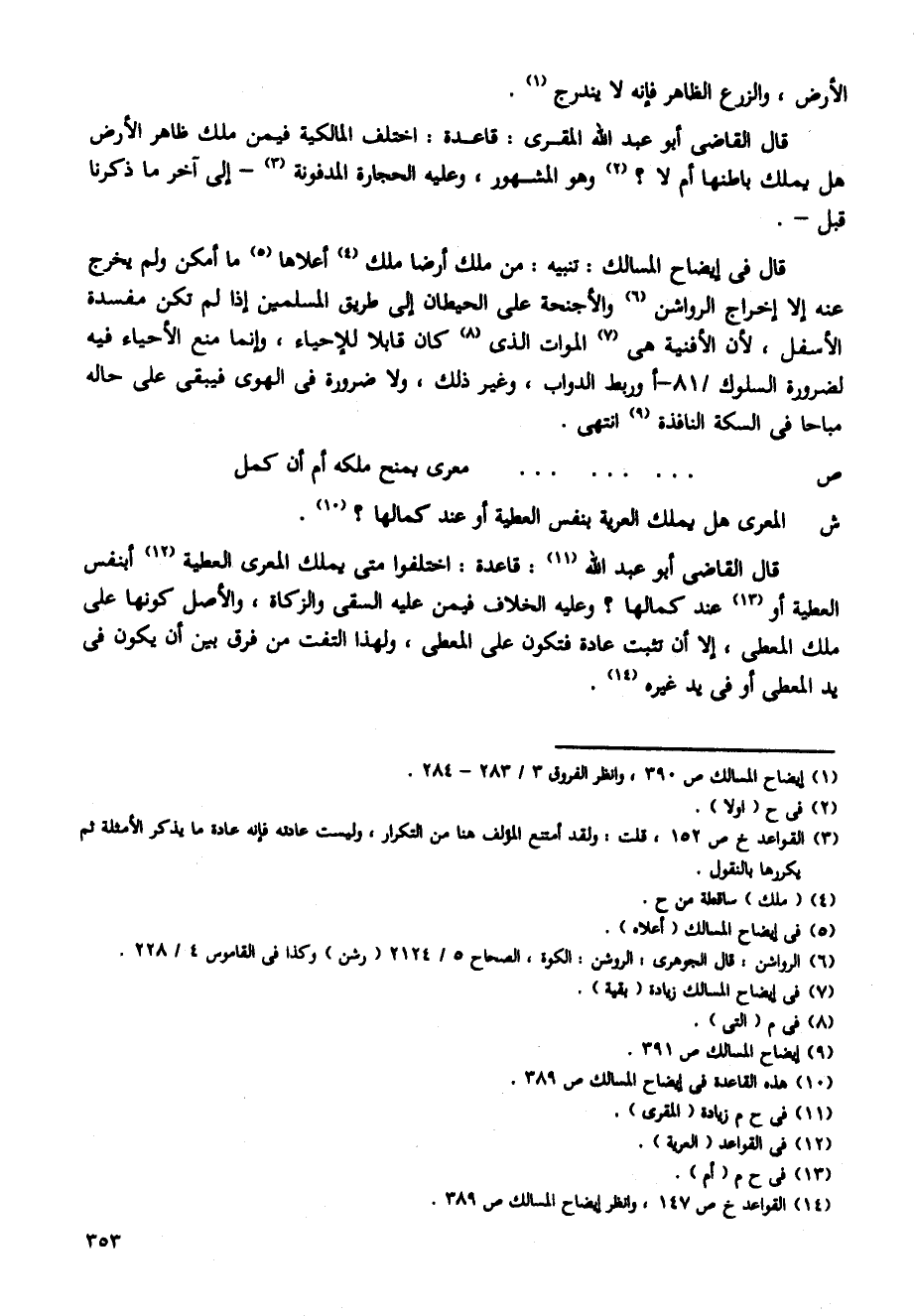 قال القاضى أبو عبد الله المقرى: قاعدة: اختلف المالكية فيمن ملك ظاهر الأرض هل يملك باطنها أم لا؟ وهو المشهور، وعليه الحجارة المدفونة -إلى آخر ما ذكرنا قبل-.