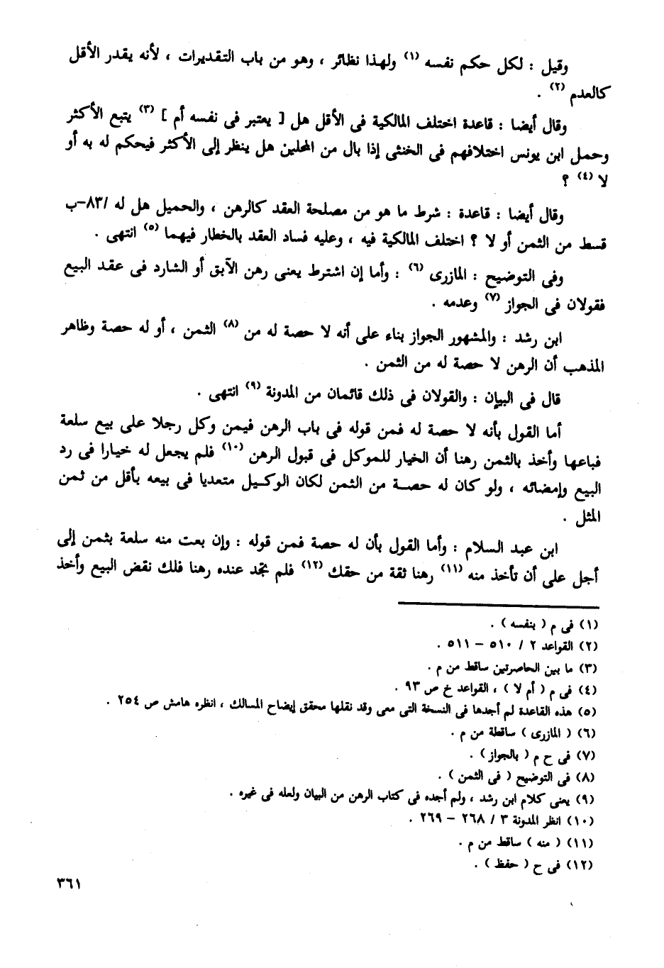 وقال أيضا: قاعدة: شرط ما هو من مصلحة العقد كالرهن، والحميل هل له /83 - ب قسط من الثمن أو لا؟ اختلف المالكية فيه، وعليه فساد العقد بالخطار فيهما انتهى.