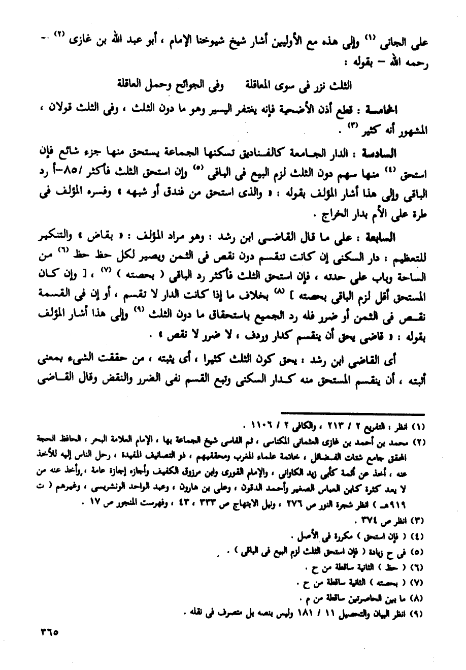 السادسة: الدار الجامعة كالفناديق تسكنها الجماعة يستحق منها جزء شائع فإن استحق منها سهم دون الثلث لزم البيع فى الباقى وإن استحق الثلث فأكثر /85 - أرد الباقى وإلى هذا أشار المؤلف بقوله: "والذى استحق من فندق أو شبهه" وفسره المؤلف فى طرة على الأم بدار الخراج.