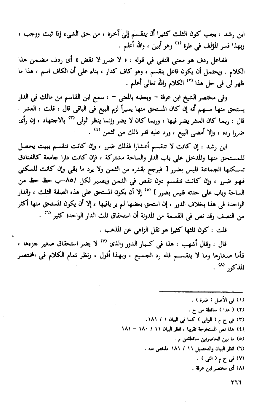 ابن رشد: إن لا تنقسم أعشارا فذلك ضرر، وإن كانت تنقسم ببيت يحصل للمستحق منها والمدخل على باب الدار والساحة مشتركة، فإن كانت دارا جامعة كالفنادق تسكنها الجماعة فليس بضرر [فيرجع بقدره من الثمن ولا يرد ما بقى وإن كانت للسكنى فهو ضرر، وإن كانت تنقسم دون نقص فى الثمن ولا يرد ما بقى وإن كانت للسكنى فهو ضرر، وإن كانت تنقسم دون نقص فى الثمن ويصير لكل /85 - ب حظ حظ من الساحة وباب على حدته فليس بضرر] إلا أن يكون المستحق على هذه الصفة الثلث، والدار الواحدة فى هذا بخلاف الدور، إن استحق بعضها لم ير باقيها، إلا أن يكون المستحق منها أكثر من النصف وقد نص فى القسمة من المدونة أن استحقاق ثلث الدار الواحدة كثير.