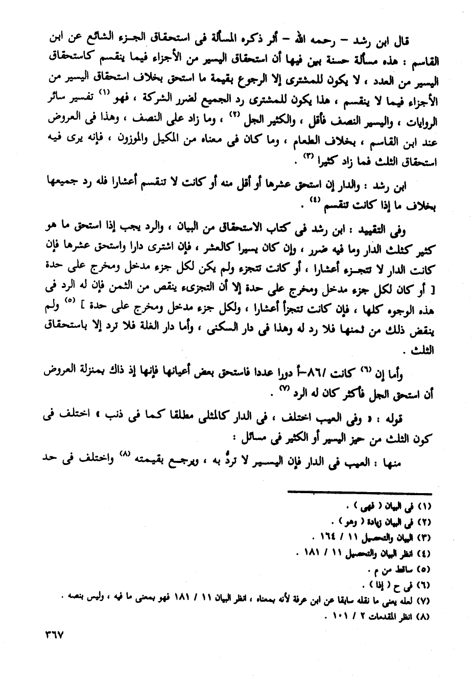 قال ابن رشد -رحمه الله- أثر ذكره المسألة فى استحقاق الجزء الشائع عن ابن القاسم: هذه مسألة حسنة بين فيها أن استحقاق اليسير من الأجزاء فيها ينقسم كاستحقاق اليسير من العدد، لا يكون للمشترى إلا الرجوع بقيمة ما استحق بخلاف استحقاق اليسير من الأجزاء فيما لا ينقسم، هذا يكون للمشترى رد الجميع لضرر الشركة، فهو تفسير سائر الروايات، واليسير النصف فأقل، والكثير الجل، وما زاد على النصف، وهذا فى العروض عند ابن القاسم، بخلاف الطعام، وما كان فى معناه من المكيل والموزون، فإنه يرى فيه استحقاق الثلث فما زاد كثيرا.