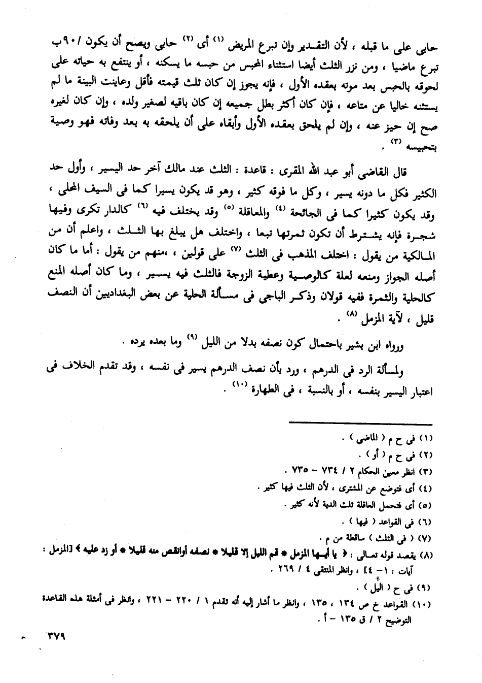 قال القاضى أبو عبد الله المقرى: قاعدة: الثلث عند مالك آخر حد اليسير، وأول حد الكثير فكل ما دونه يسير، وكل ما فوقه كثير، وهو قد يكون يسيرا كما فى السيف اخلي، وقد يكون كثيرا كما فى الجائحة والمعاقلة وقد يختلف فيه كالدار تكرى وفيها شجرة فإنه يشترط أن تكون ثمرتها تبعا، واختلف هل يبلغ بها الثالث، واعلم أن من المالكية من يقول: اختلف المذهب فى الثلث على قولين، منهم من يقول: أما ما كان أصله الجواز ومنعه لعلة كالوصية وعطية الزوجة فالثلث فيه يسير، وما كان أصله المنع كالحلية والثمرة ففيه قولان وذكر الباجى فى مسألة الحلية عن بعض البغداديين أن النصف قليل، لآية المزمل.