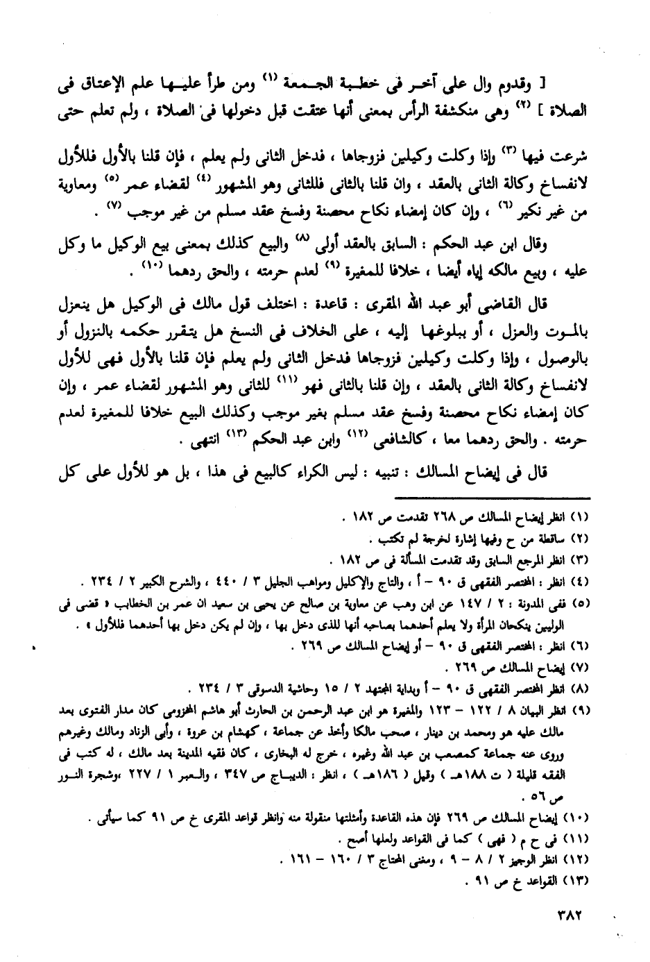 قال القاضى أبو عبد الله المقرى: قاعدة: اختلف قول مالك فى الوكيل هل ينعزل بالموت والعزل، أو ببلوغها إليه، على الخلاف فى النسخ هل يتقرر حكمه بالنزول أو بالوصول، وإذا وكلت وكيلين فزوجاها فدخل الثانى ولم يعلم فإن قلنا بالأول فهى للأول لانفساخ وكالة الثانى بالعقد، وإن قلنا بالثانى فهو للثانى وهو المشهور لقضاء عمر، وإن كان إمضاء نكاح محصنة وفسخ عقد مسلم بغير موجب وكذلك البيع خلافا للمغيرة لعدم حرمته. والحق ردهما معا، كالشافعى وابن عبد الحكم انتهى.