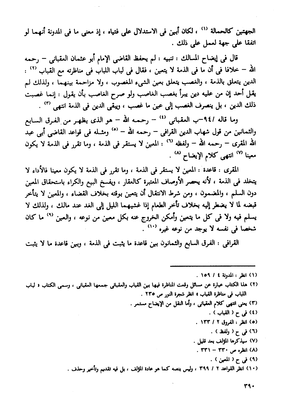 وما قاله /94 - ب العقبانى - رحمه الله - هو الذى يظهر من الفرق السابع والثمانين من قول شهاب الدين القرافى - رحمه الله - ومثله فى قواعد القاضى أبى عبد الله المقرى - رحمه الله - ولفظه: المعين لا يستقر فى الذمة، وما تقرر فى الذمة لا يكون معينا انتهى كلام الإيضاح.