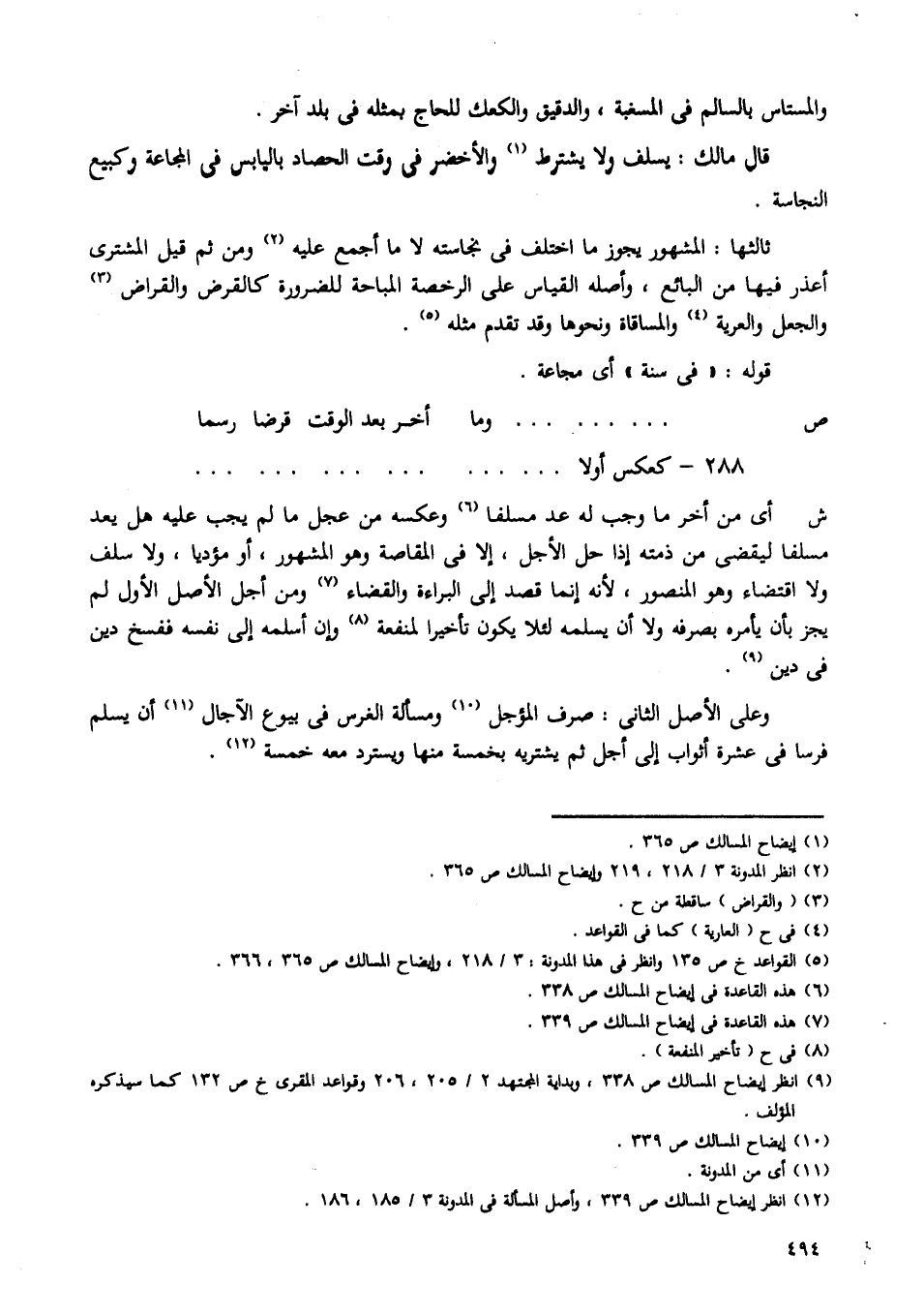 قال مالك: يسلف ولا يشترط والأخضر في وقت الحصاد باليابس في المجاعة وكبيع النجاسة.