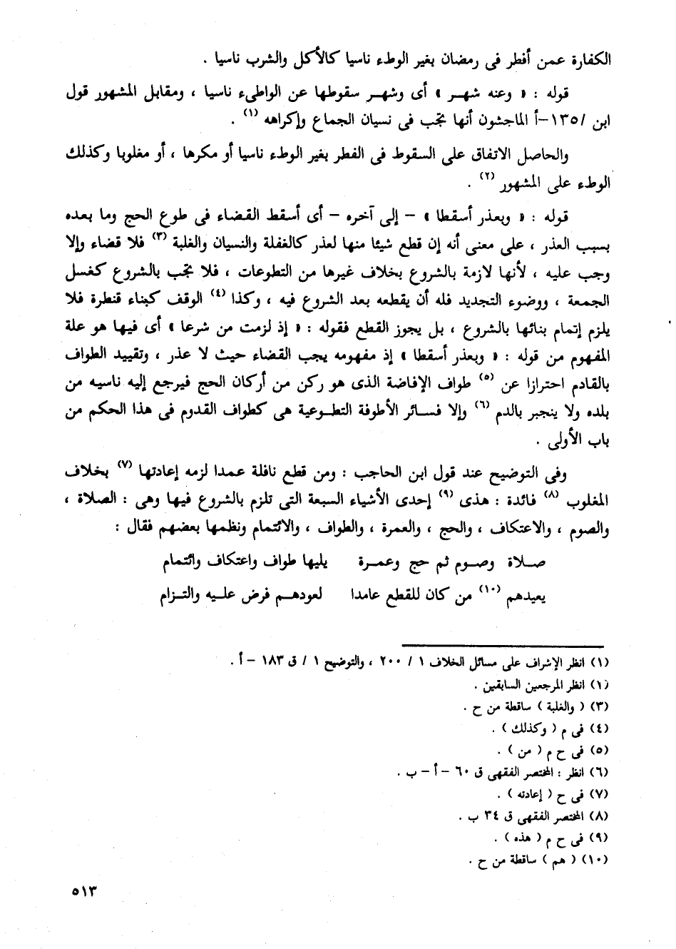 وفى التوضيح عند قول ابن الحاجب: ومن قطع نافلة عمدا لزمه إعادتها بخلاف المغلوب فائدة: هذى إحدى الأشياء السبعة التى تلزم بالشروع فيها وهى: الصلاة، والصوم، والاعتكاف، والحج، والعمرة، والطواف، والائتمام ونظمها بعضهم فقال: