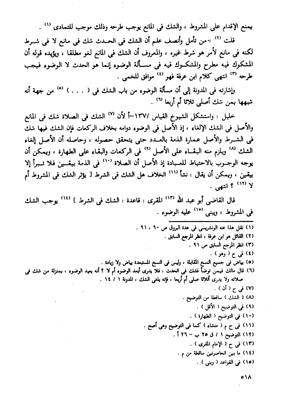 قال القاضى أبو عبد الله المقرى: قاعدة: الشك فى الشرط] يوجب الشك فى المشروط، ويبنى عليه الوضوء.