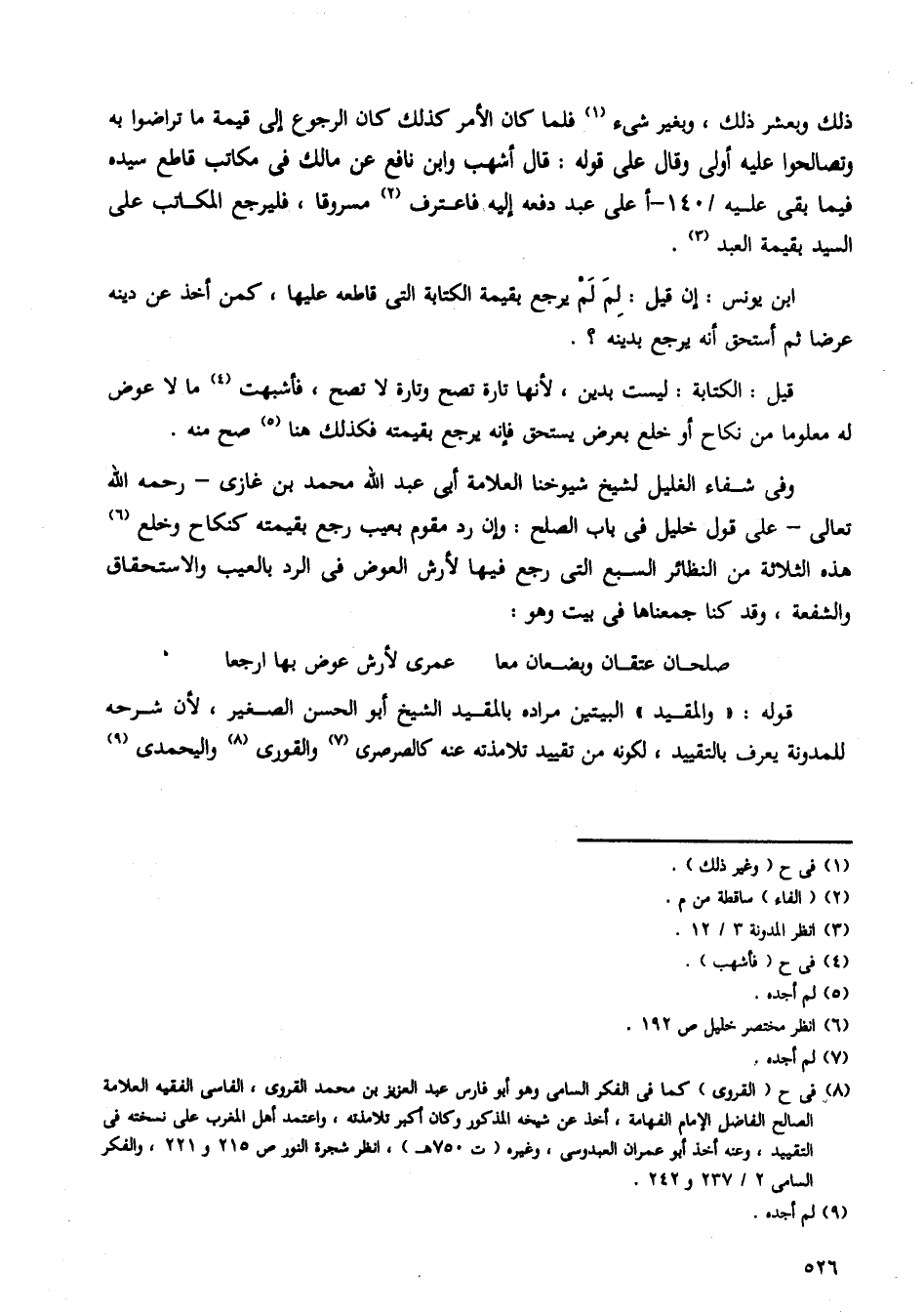 وفي شفاء الغليل لشيخ شيوخنا العلامة أبي عبد الله محمد بن غازي - رحمه الله تعالى - على قول خليل في باب الصلح: وإن رد مقوم بعيب رجع بقيمته كنكاح وخلع هذه الثلاثة من النظائر السبع التي رجع فيها لأرش العوض في الرد بالعيب والاستحقاق والشفعة، وقد كنا جمعناها في بيت وهو: