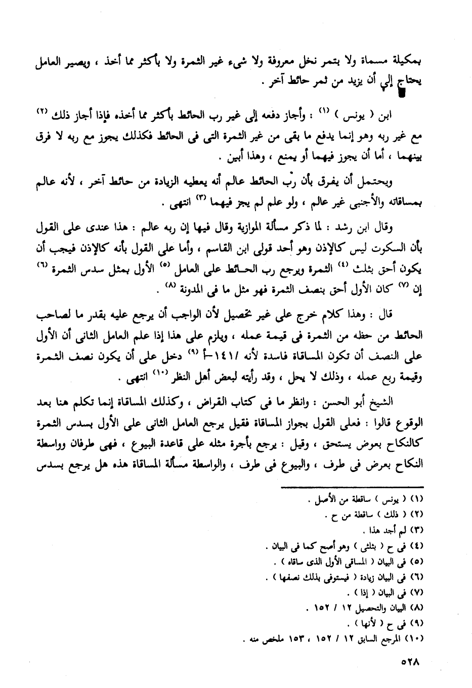 قال: وهذا كلام خرج على غير تحصيل لأن الواجب أن يرجع عليه بقدر ما لصاحب الحائط من حظه من الثمرة في قيمة عمله، ويلزم على هذا إذا علم العامل الثاني أن الأول على النصف أن تكون المساقاة فاسدة لأنه /141 - أدخل على أن يكون نصف الثمرة وقيمة ربع عمله، وذلك لا يحل، وقد رأيته لبعض أهل النظر انتهى.