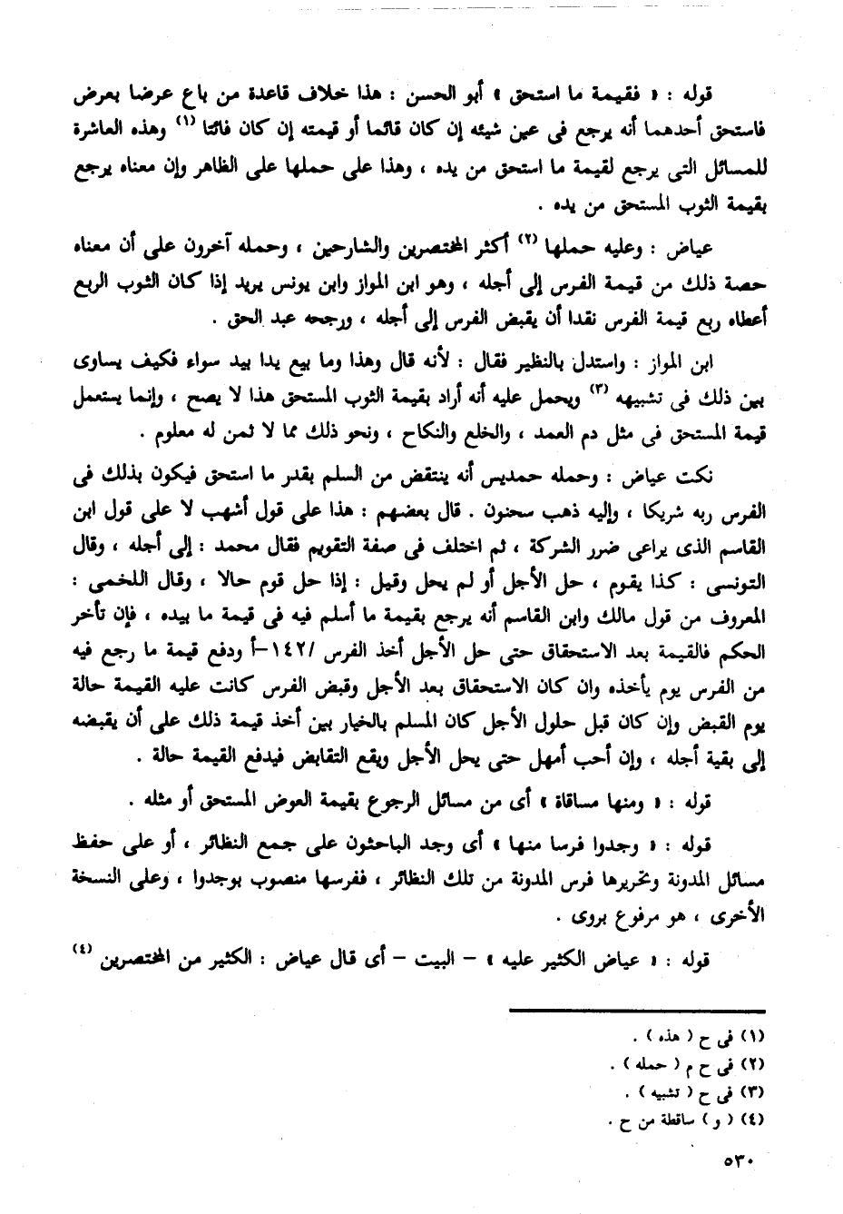 نكت عياض: وحمله حمديس أنه ينتقض من السلم بقدر ما استحق فيكون بذلك في الفرس ربه شريكا، وإليه ذهب سحنون. قال بعضهم: هذا على قول أشهب لا على قول ابن القاسم الذي يراعى ضرر الشركة، ثم اختلف في صفة التقويم فقال محمد: إلى أجله، وقال التونسي: كذا يقوم، حل الأجل أو لم يحل وقيل: إذا حل قوم حالا، وقال اللخمي: المعروف من قول مالك وابن القاسم أنه يرجع بقيمة ما أسلم فيه في قيمة ما بيده، فإن تأخر الحكم فالقيمة بعد الاستحقاق حتى حل الأجل أخذ الفرس /142 - أودفع قيمة ما رجع فيه من الفرس يوم يأخذه وإن كان الاستحقاق بعد الأجل وقبض الفرس كانت عليه القيمة حالة يوم القبض وإن كان قبل حلول الأجل كان المسلم بالخيار بين أخذ قيمة ذلك على أن يقبضه إلى بقية أجله، وإن أحب أمهل حتى يحل الأجل ويقع التقابض فيدفع القيمة حالة.
