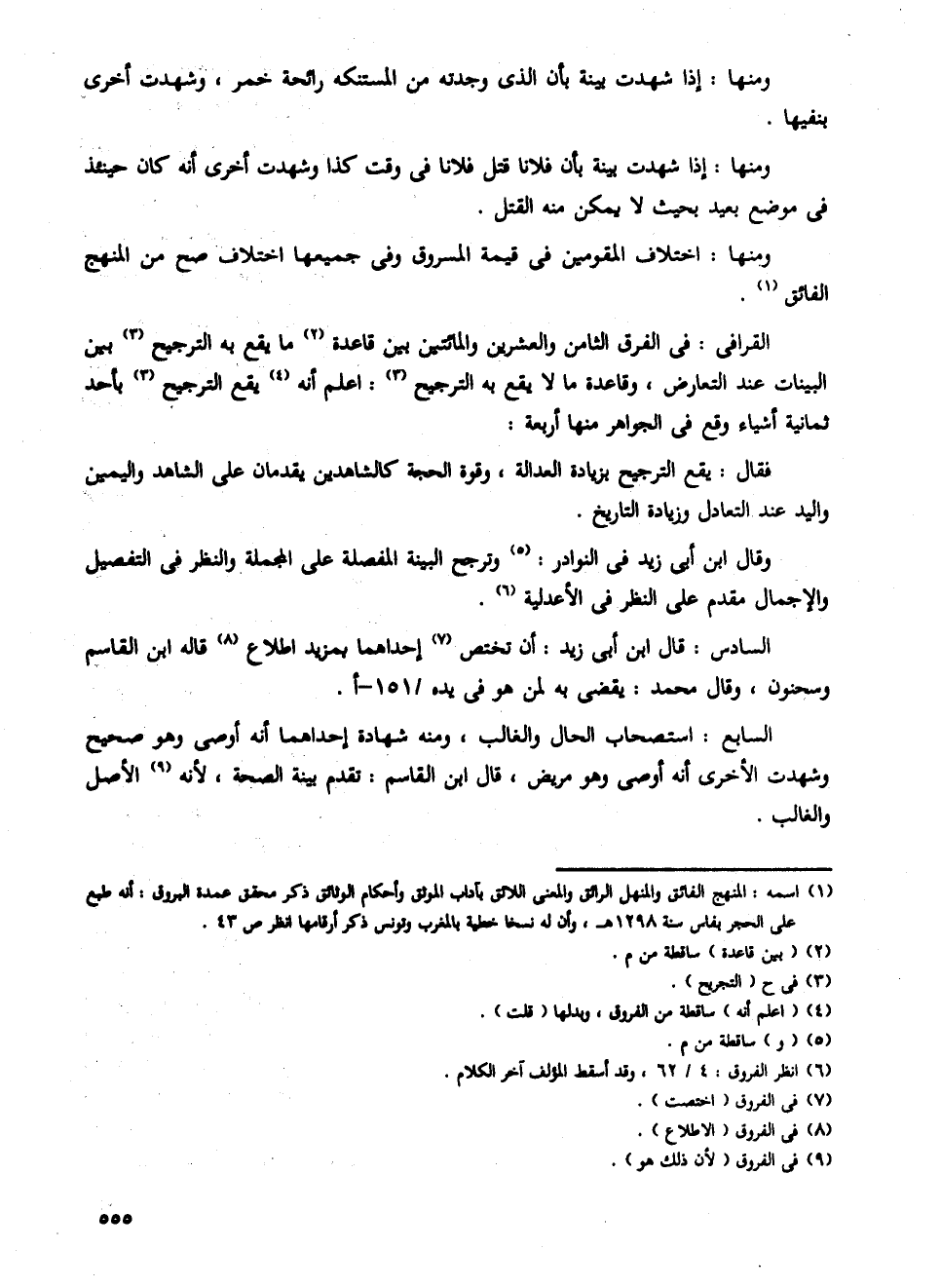 القرافى: فى الفرق الثامن والعشرين والمائتين بين قاعدة ما يقع به الترجيح بين البينات عند التعارض، وقاعدة ما لا يقع به الترجيح: اعلم أنخ يقع الترجيح بأحد ثمانية أشياء وقع فى الجواهر منها أربعة: