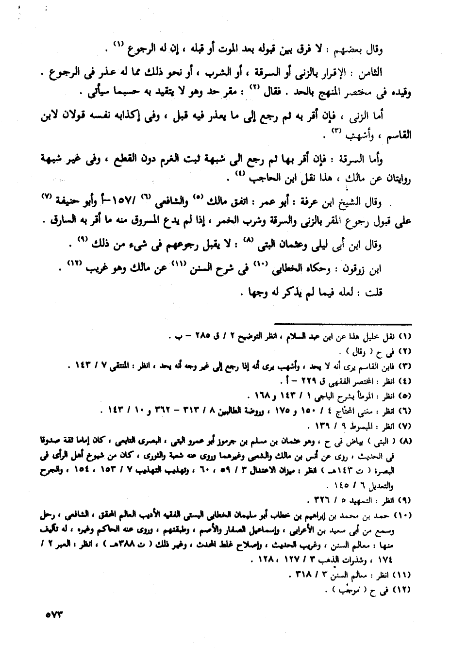 وقال الشيخ ابن عرفة: أبو عمر: اتفق مالك والشافعى/ 157 - أوأبو حنيفة على قبول رجوع المقر بالزنى والسرقة وشرب الخمر، إذا لم يدع المسروق منه ما أقر به السارق.