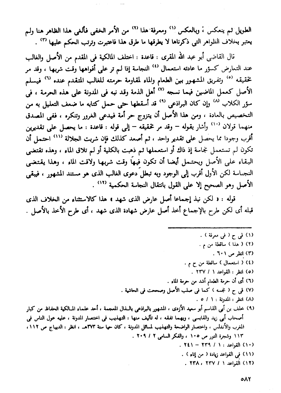 قال القاضى أبو عبد الله المقرى: قاعدة: اختلف المالكية فى المقدم من الأصل والغالب عند التمارض كسؤر ما عادته استعمال النجاسة إذا لم تر على أفواهها وقت شربها، وقد مر تحقيقه وتفريق المشهور بين الطعام والماء لمقاومة حرمته للغالب المتقدم عنده فيسلم الأصل كعمل الماضين فيما نسجه أهل الذمة وقد نبه فى المدونة على هذه الحرمة، فى سؤر الكلاب وإن كان البراذعى قد أسقطها حتى حمل كتابه ما ضعف التعليل به من التخصيص بالعادة، ومن هذا الأصل أن يتزوج حر أمة فيدعىى الغرور وتنكره، ففى المصدق منهما قولان وأشار بقوله- وقد مر تحقيقه- إلى قوله: قاعدة: ما يحصل على تقديرين أقرب وجودا مما يحصل على تقدير واحد، ثم أصعد كذلك فإن شربت الجلالة احتمل أن تكون لم تستعمل نجاسة إذ ذاك أو استعملها ثم ذهبت بالكلية أو لم تلاق الماء، وهذه تقتضى البقاء على الأصل ويحتمل أيضا أن تكون فيها وقت شربها ولاقت الماء، وهذا يقتضى النجاسة لكن الأول أقرب إلى الوجود وبه تبطل دعوى الغالب الذى هو مستند المشهور، فيبقى الأصل وهو الصحيح إلا على القول بانتقال النجاسة الحكمية.