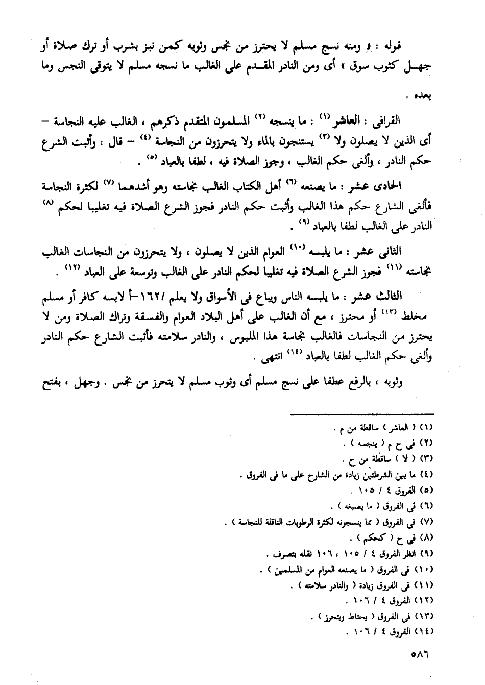 الثالث عشر: ما يلبسه الناس ويباع فى الأسواق ولا يعلم/ 162 - ألابسه كافر أو مسلم مخلط أو محترز، مع أن الغالب على أهل البلاد العوام والفسقة وتراك الصلاة ومن لا يحترز من النجاسات فالغالب نجاسة هذا الملبوس، والنادر سلامته فأثبت الشارع حكم النادر وألغى حكم الغالب لطفا بالعباد انتهى.