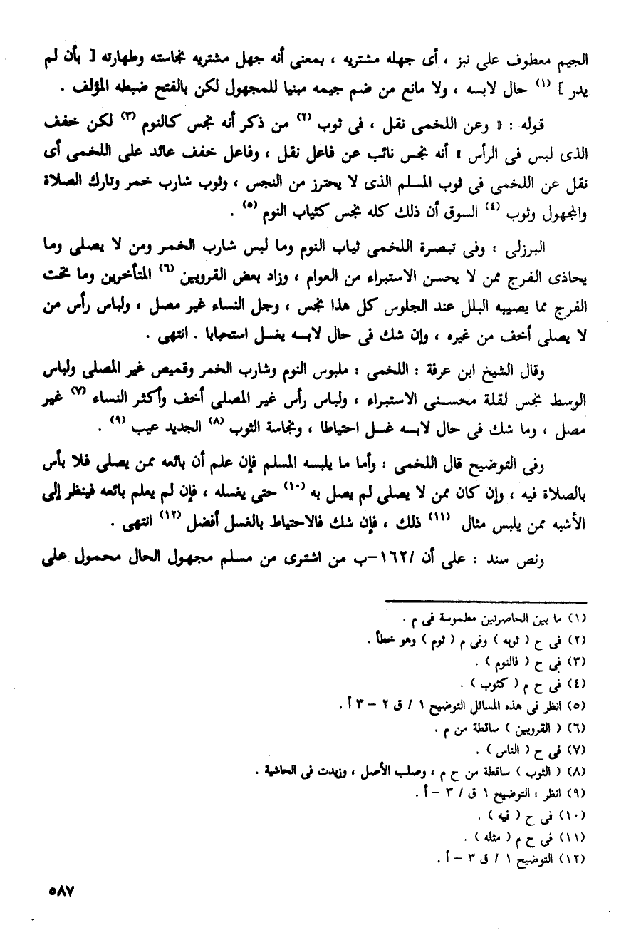 وقال الشيخ ابن عرفة: اللخمى: ملبوس النوم وشارب الخمر وقميص غير المصلى ولباس الوسط نجس لقلة محسنى الاستبراء، ولباس رأس غير المصلى أخف وأكثر النساء غير مصل، وما شك فى حال لابسه غسل احتياطا، ونجاسة الثوب الجديد عيب.