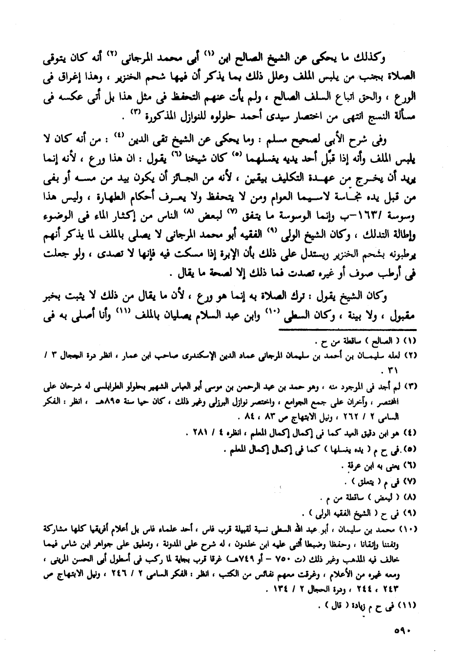 وكذلك ما يحكى عن الشيخ الصالح ابن أيى محمد المرجانى أنه كان يتوقى الصلاة بجنب من يلبس الملف وعلل ذلك بما يذكر أن فيها شحم الخنزير، وهذا إغراق فى الورع، والحق اتباع السلف الصالح، ولم يأت عنهم التحفظ فى مثل هذا بل أتى عكسه فى مسألة النسج انتهى من اختصار سيدى أحمد حلولوه للنوازل المذكورة.