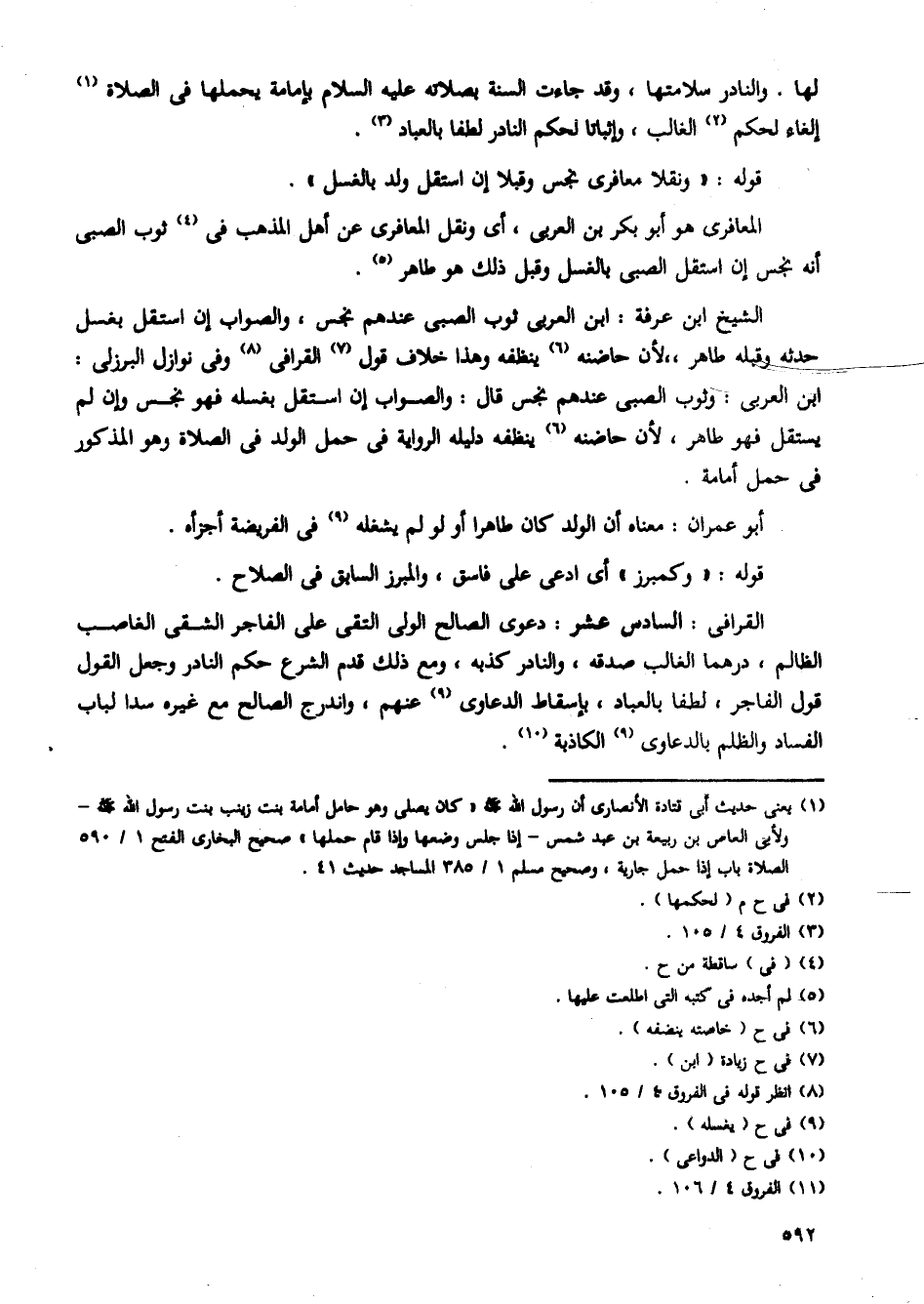 الشيخ ابن عرفة: ابن العربى ثوب الصبى عندهم نجس، والصواب إن استقل بغسل حدثه وقبله طاهر، لأن حاضنه ينظفه وهذا خلاف قول القرافى وفى نوازل البرزلى: ابن العربى: وثوب الصبى عندهم نجس قال: والصواب إن استقل بغسله فهو نجس وإن لم يستقل فهو طاهر، لأن حاضنه ينظفه دليله الرواية فى حمل الولد فى الصلاة وهو المذكور فى حمل أمامة.