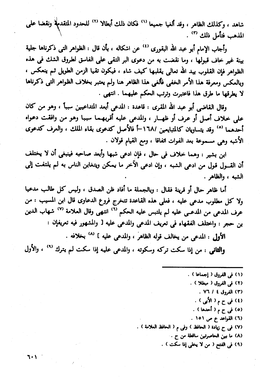 أما ظاهر حال أو قرينة فقال: وبالجملة ما أفاد ظن الصدق، وليس كل طالب مدعيا ولا كل مطلوب مدعى عليه، فعلى هذه القاعدة تتخرج فروع الدعاوى قال ابن المسيب: من عرف المدعى من المدعى عليه لم يلتبس عليه الحكم انتهى وقال العلامة شهاب الدين بن حجر: واختلف الفقهاء فى تعريف المدعى والمدعى عليه [والمشهور فيه تعريفان: