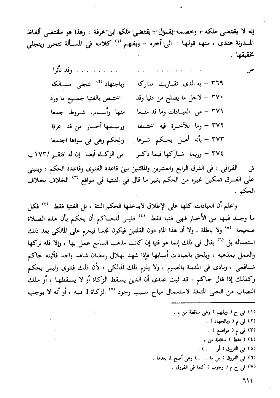 واعلم أن العبادات كلها على الإطلاق لا يدخلها الحكم البتة، بل الفتيا فقط فكل ما وجد فيها من الأخبار فهى فتيا فقط فليس للحاكم أن يحكم بأن هذه الصلاة صحيحة ولا باطلة، ولا أن هذا الماء دون القلتين فيكون نجسا فيحرم على المالكى بعد ذلك استعماله بل يقال فى ذلك إنما هو فتيا إن كانت مذهب السامع عمل بها، وإلا فله تركها والعمل بمذهبه، ويلحق بالعبادات أسبابها فإذا شهد بهلال رمضان شاهد واحد فأثبته حاكم شافعى، ونادى فى المدينة بالصوم، ولا يلزم ذلك المالكى، لأن ذلك فتوى وليس بحكم وكذلك إذا قال حاكم: قد ثبت عندى أن الدين يسقط الزكاة أو لا يسقطها، أو ملك النصاب من الحلى المتخذ لاستعمال مباح سبب وجود الزكاة [فيه، أو أنه لا يوجب