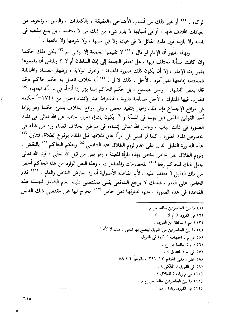وبهذا يظهر أن الإمام لو قال: لا تقيموا الجمعة إلا بإذنى لم يكن ذلك حكما وان كانت مسألة مختلف فيها، هل تفتقر الجمعة إلى إذن السلطان أم لا؟ وللناس أن يقيموها بغير إذن الإمام، إلا أن يكون ذلك صورة المشاقة، وخرق الولاية، وإظهار الفساد والمخالفة فممتنعة إقامتها بغير أمره، لأجل [ذلك لا ل] انه خلاف اتصل به حكم حاكم، وقد قاله بعض الفقهاء، وليس بصحيح، بل حكم الحاكم إنما يؤثر إذا أنشأ في مسألة اجتهاد تتقارب فيها المدارك، لأجل مصلحة دنيوية، فاشتراط قيد الإنشاء احتراز من/ 174 - أحكمه فى مواقع الإجماع فإن ذلك إخبار وتنفيذ محض، وفى مواقع الخلاف ينشئ حكما وهو إلزاما أحد القولين اللذين قيل بهما في المسألة ويكون إنشاؤه اخبارا خاصا عن الله تعالى فى تلك الصورة فى ذلك الباب، وجعل لله تعالى إنشاءه في مواطن الخلاف قضاء ورد من قبله في خصوص تلك الصورة، كما لو قضى فى امرأة علق طلاقها قبل الملك بوقوع الطلاق فتناول هذه الصورة الدليل الدال على عدم لزوم الطلاق عند الشافعى وحكم الحاكم بالنقض، ولزوم الطلاق نص خاص يختص بهذه المرأة المعينة، وهو نص من قبل الله تعالى، فإن الله تعالى جعل ذلك للحاكم رفعا للخصومات والمشاجرات، وهذا النص الوارد من هذا الحاكم أخص من ذلك الدليل [فتقدم عليه، لأن القاعدة الأصولية أنه إذا تعارض الخاص والعام] قدم الخاص على العام، فلذلك لا يرجع الشافعى يفتى بمقتضى دليله العام الشامل لجملة هذه القاعدة في هذه الصورة، منها لتناولها نص خاص مخرج لها عن مقتضى ذلك الدليل