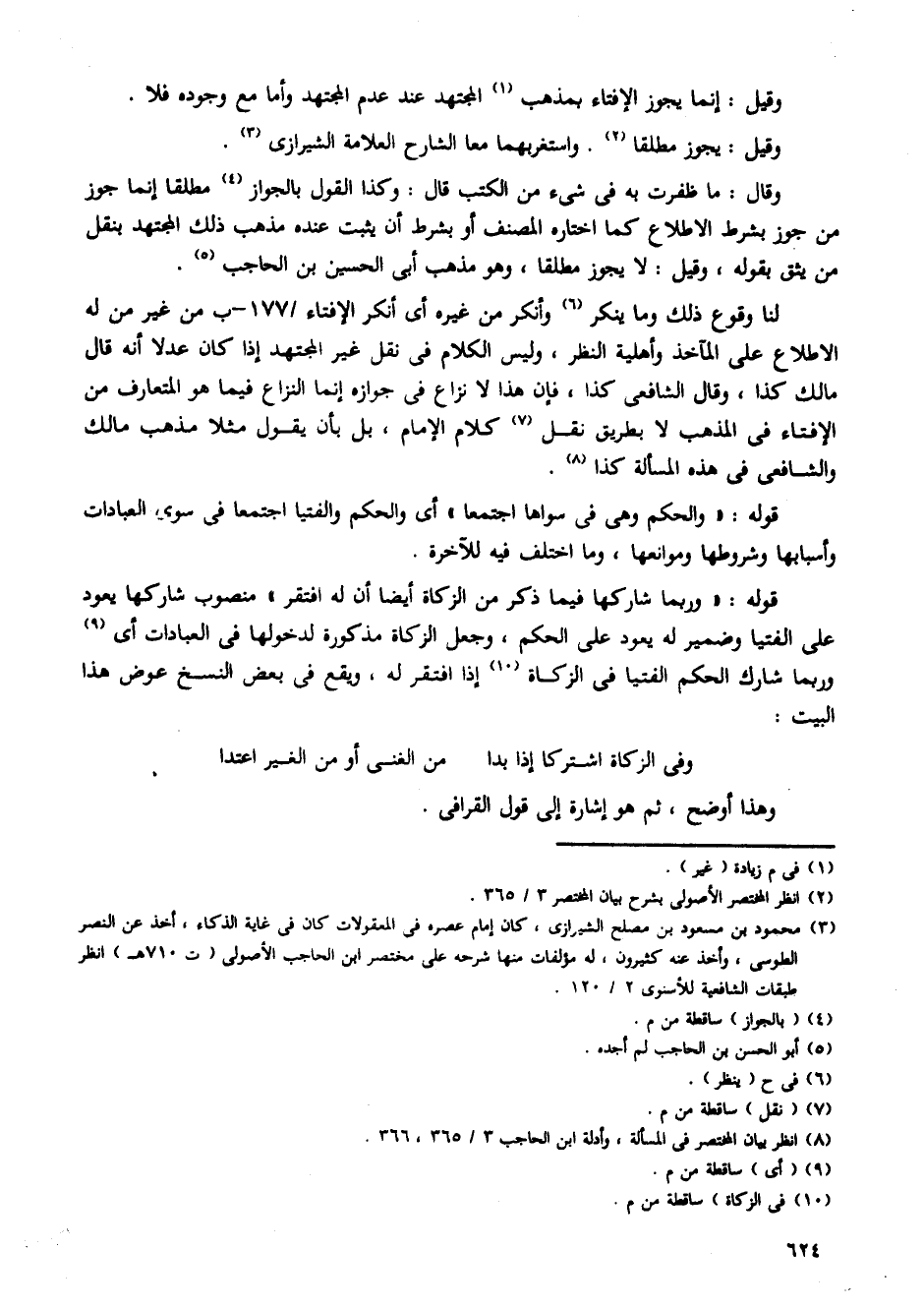 لنا وقوع ذلك وما ينكر وأنكر من غيره أى أنكر الإفتاء/ 177 - ب من غير من له الاطلاع على المآخذ وأهلية النظر، وليس الكلام فى نقل غير المجتهد إذا كان عدلا أنه قال مالك كذا، وقال الشافعى كذا، فإن هذا لا نزاع فى جوازه إنما النزاع فيما هو المتعارف من الإفتاء فى المذهب لا بطريق نقل كلام الإمام، بل بأن يقول مثلا مذهب مالك والشافعى فى هذه المسألة كذا.