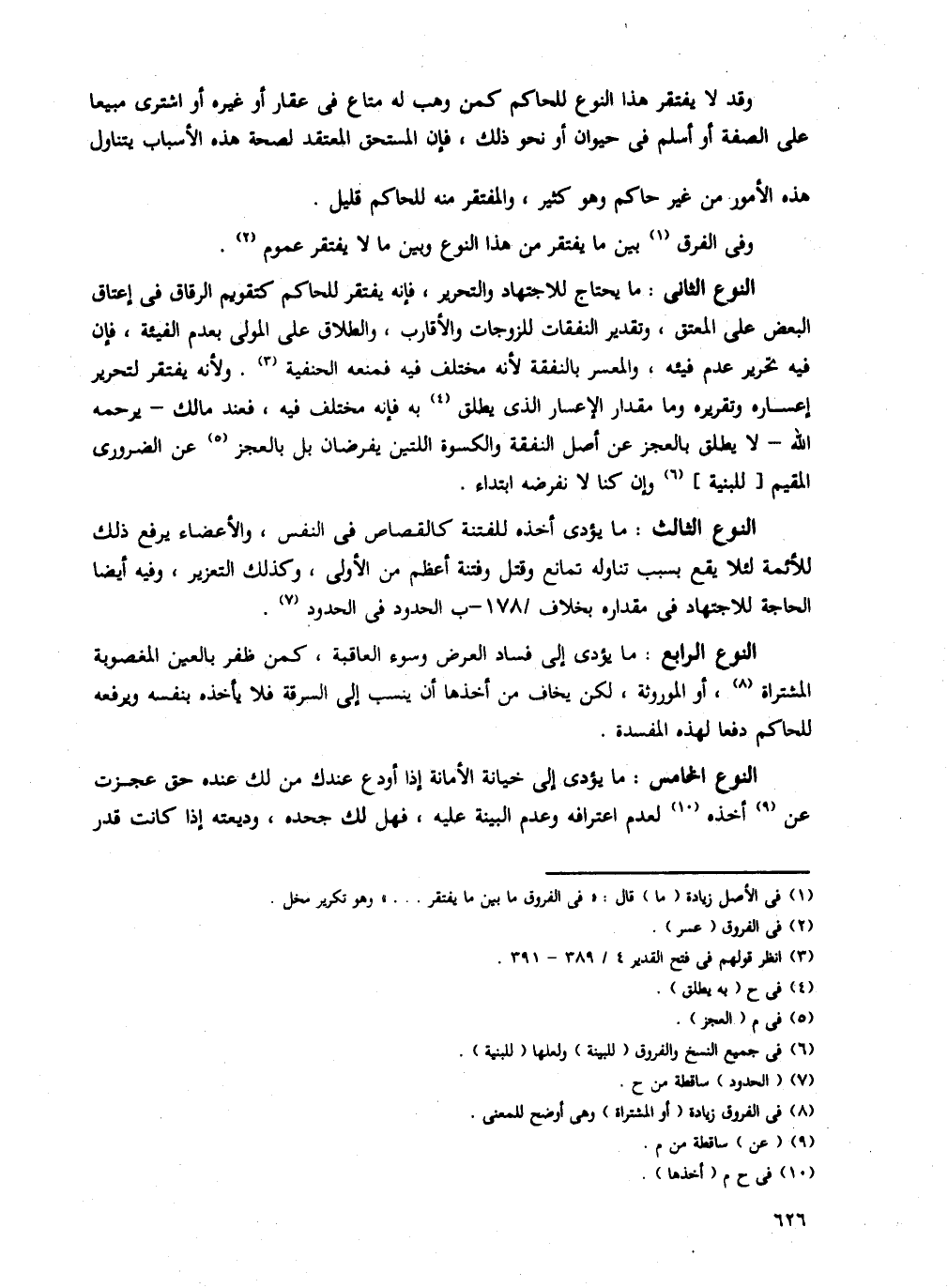 النوع الثانى: ما يحتاج للاجتهاد والتحرير، فإنه يفتقر للحاكم كتقويم الرقاق في إعتاق البعض على المعتق، وتقدير النفقات للزوجات والأرقاب، والطلاق على المولى بعدم الفيئة، فإن فيه تحرير عدم فيئه، والمعسر بالنفقة لأنه مختلف فيه فمنعه الحنفية. ولأنه يفتقر لتحرير إعساره وتقريره وما مقدار الإعسار الذى يطلق به فإنه مختلف فيه، فعند مالك- يرحمه الله- لا يطلق بالعجز عن أصل النفقة والكسوة اللتين يفرضان بل بالعجز عن الضرورى المقيم [للبنية] وإن كنا لا نفرضه ابتداء.