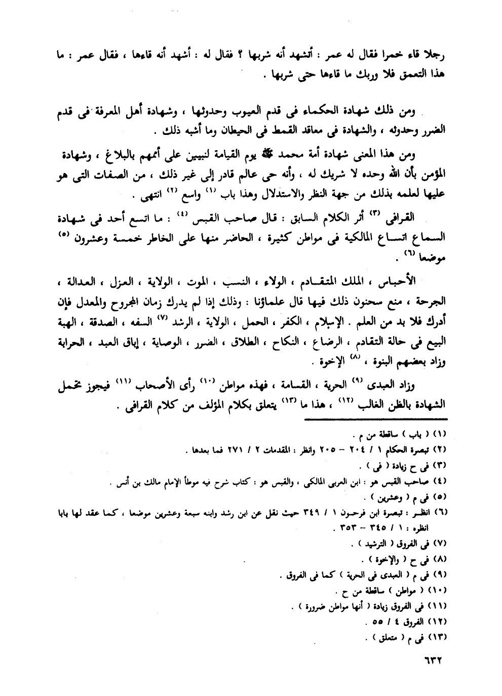 القرافى أثر الكلام السابق: قال صاحب القبس: ما اتسع أحد فى شهادة السماع اتساع المالكية فى مواطن كثيرة، الحاضر منها على الخاطر خمسة وعشرون موضعا.
