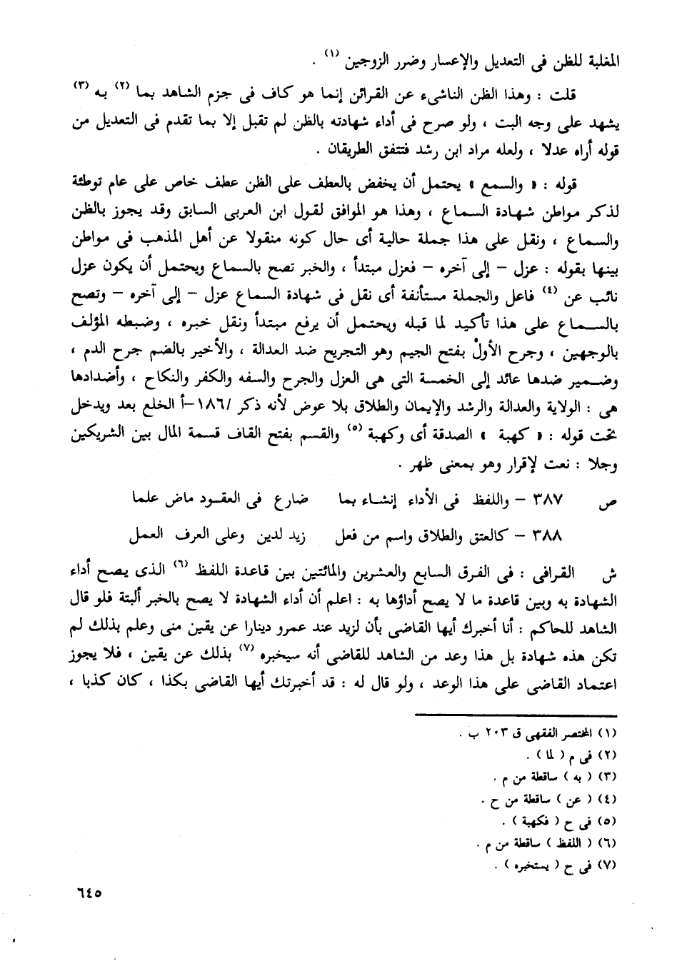 قلت: وهذا الظن الناشئ عن القرائن إنما هو كاف فى جزم الشاهد بما به يشهد على وجه البت، ولو صرح فى أداء شهادته بالظن لم تقبل إلا بما تقدم فى التعديل من قوله أراه عدلا، ولعله مراد ابن رشد فتتفق الطريقان.