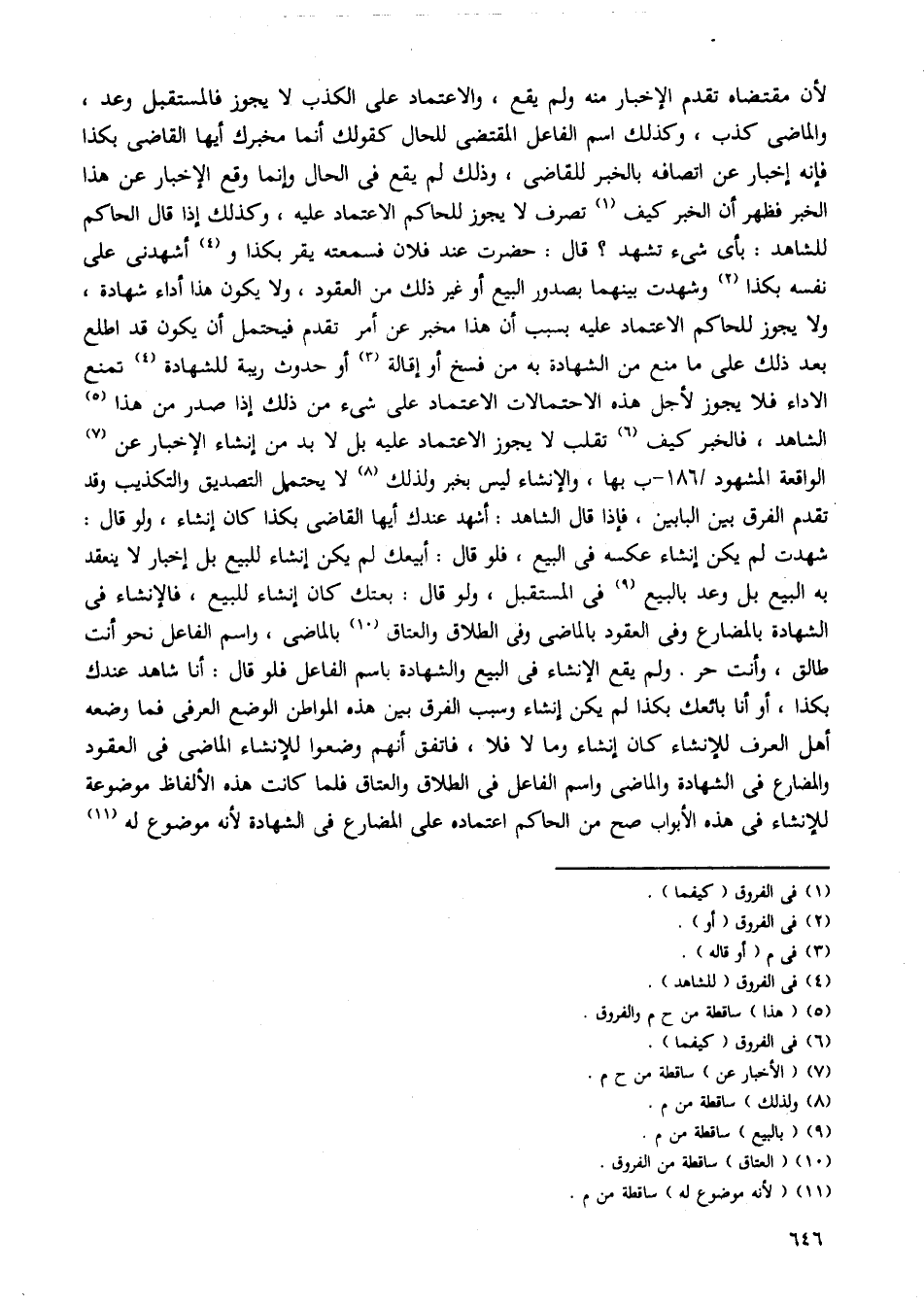 لأن مقتضاه تقدم الإخبار منه ولم يقع، والاعتماد على الكذب لا يجوز فالمستقبل وعد، والماضى كذب، وكذلك اسم الفاعل المقتضى للحال كقولك أنما مخبرك أيها القاضى بكذا فإنه إخبار عن اتصافه بالخبر للقاضى، وذلك لم يقع فى الحال وإنما وقع الإخبار عن هذا الخبر فظهر أن الخبر كيف تصرف لا يجوز للحاكم الاعتماد عليه، وكذلك إذا قال الحاكم للشاهد: بأى شئ تشهد؟ قال: حضرت عند فلان فسمعته يقر بكذا وأشهدنى على نفسه بكذا وشهدت بينهما بصدور البيع أو غير ذلك من العقود، ولا يكون هذا أداء شهادة، ولا يجوز للحاكم الاعتماد عليه بسبب أن هذا مخبر عن أمر تقدم فيحتمل أن يكون قد اطلع بعد ذلك على ما منع من الشهادة به من فسخ أو إقالة أو حدوث ريبة للشهادة تمنع الاداء فلا يجوز لأجل هذه الاحتمالات الاعتماد على شئ من ذلك إذا صدر من هذا الشاهد، فالخبر كيف تقلب لا يجوز الاعتماد عليه بل لابد من إنشاء الإخبار عن الواقعة المشهود/ 186 - ب بها، والإنشاء ليس بخبر ولذلك لا يحتمل التصديق والتكذيب وقد تقدم الفرق بين البابين، فإذا قال الشاهد: أشهد عندك أيها القاضى بكذا كان إنشاء، ولو قال: شهدت لم يكن إنشاء عكسه فى البيع، فلو قال: أبيعك لم يكن إنشاء للبيع بل إخبار لا ينعقد به البيع بل وعد بالبيع فى المستقبل، ولو قال: بعتك كان إنشاء للبيع، فالإنشاء فى الشهادة بالمضارع وفى العقود بالماضى وفى الطلاق والعتاق بالماضى، ولم الفاعل نحو أنت طالق، وأنت حر. ولم يقع الإنشاء فى البيع والشهادة باسم الفاعل فلو قال: أنا شاهد عندك بكذا، أو أنا بائعك بكذا لم يكن إنشاء وسبب الفرق بين هذه المواطن الوضع العرفى فما وضعه أهل العرف للإنشاء كان إنشاء وما لا فلا، فاتفق أنهم وضعوا للإنشاء الماضى فى العقود والمضارع فى الشهادة والماضى واسم الفاعل فى الطلاق والعتاق فلما كانت هذه الألفاظ موضوعة للإنشاء فى هذه الأبواب صح من الحاكم اعتماده على المضارع فى الشهادة لأنه موضوع له