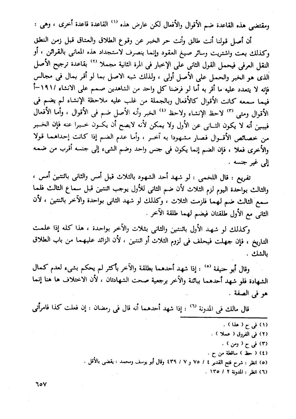 أن أصل قولنا أنت طالق وأنت حر الخبر عن وقوع الطلاق والعتاق قبل زمن النطق وكذلك بعت واشتريت وسائر صيغ العقود وإنما ينصرف لاستجداد هذه المعاني بالقرائن، أو النقل العرفي فيحمل القول الثاني على الإخبار في المرة الثانية مجملا بقاعدة ترجيح الأصل الذي هو الخبر والحمل على الأصل أولى، ولذلك شبه الأصل بما لو أقر بمال في مجالس فإنه لا يتعدد عليه ما أقر به أما لو فرضنا كل واحد من الشاهدين صمم على الإنشاء/ 191 - أفيما سمعه كانت الأقوال كالأفعال وبالجملة من غلب عليه ملاحظة الإنشاء لم يضم في الأقوال ومتى لاحظ الإنشاء ولاحظ الخبر وأنه الأصل ضم في الأقوال، وأما الأفعال فيبين أنه لا يكون الثاني عن الأول ولا يمكن لأنه لا يصح أن يكون خبرا عنه فإن الخبر من خصائص الأقوال فصار مشهودا به آخر، وأما عدم الضم إذا كانت إحداهما قولًا والأخرى فعلًا، فإن الضم إنما يكون في جنس واحد وضم الشيء إلى جنسه أقرب من ضمه للي غير جنسه.