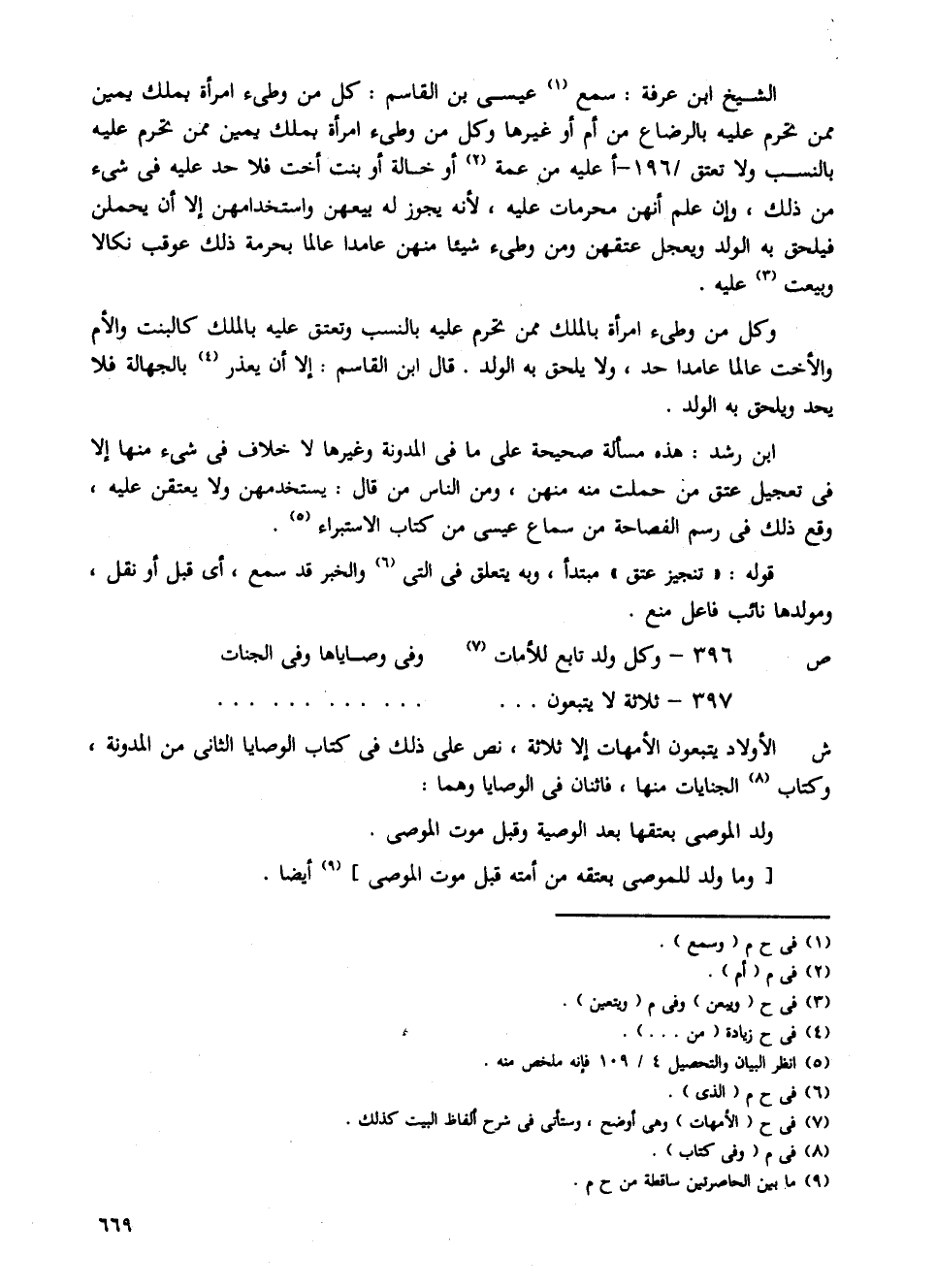 ابن رشد: هذه مسألة صحيحة على ما في المدونة وغيرها لا خلاف في شيء منها إلا في تعجيل عتق من حملت منه منهن، ومن الناس من قال: يستخدمهن ولا يعتقن عليه، وقع ذلك في رسم الفصاحة من سماع عيسي من كتاب الاستبراء.