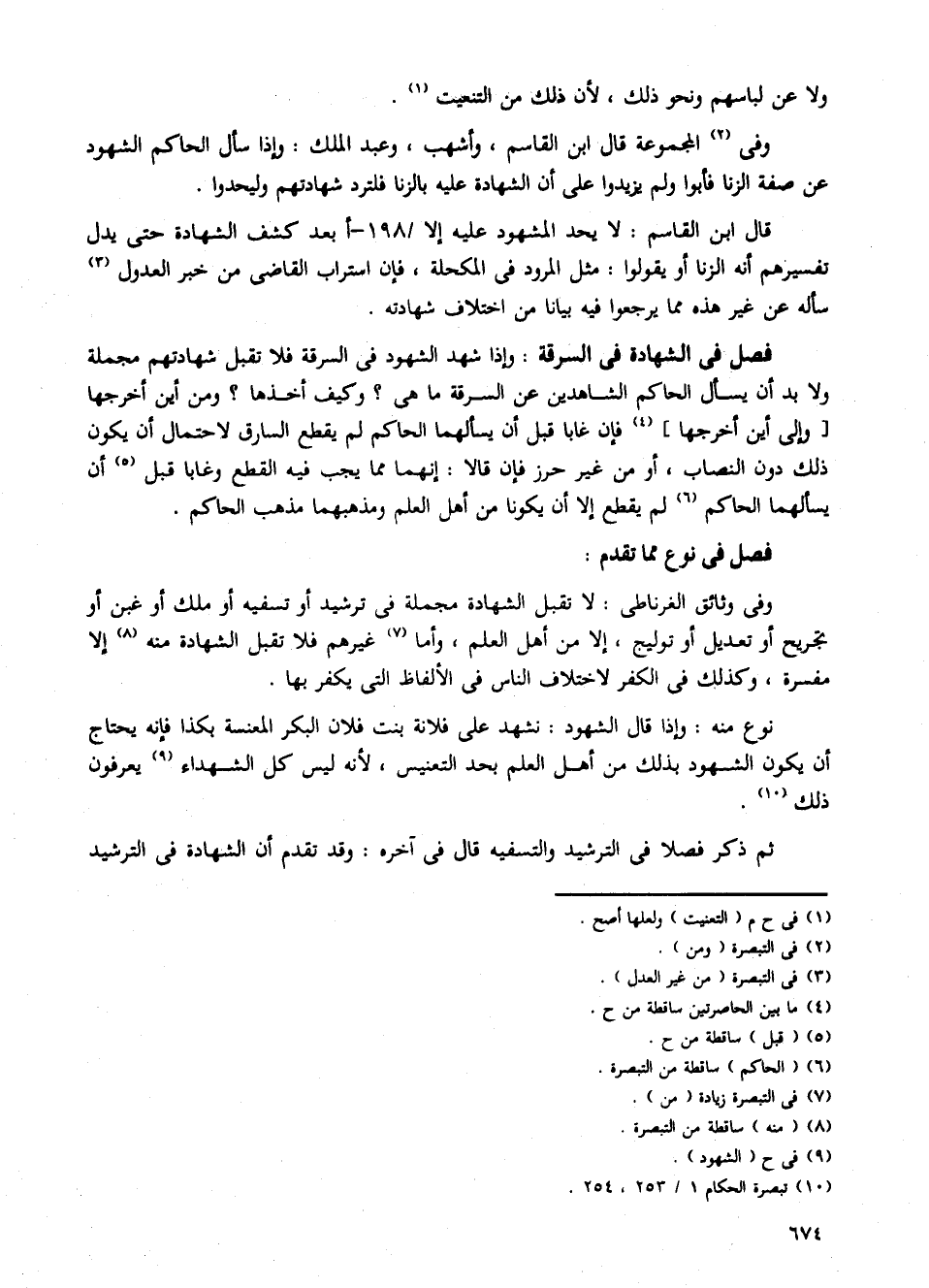 وفي وثائق الغرناطي: لا تقبل الشهادة مجملة في ترشيد أو تسفيه أو ملك أو غبن أو تجريح أو تعديل أو توليج، إلا من أهل العلم، وأما غيرهم فلا تقبل الشهادة منه إلا مفسرة، وكذلك في الكفر لاختلاف الناس في الألفاظ التي يكفر بها.