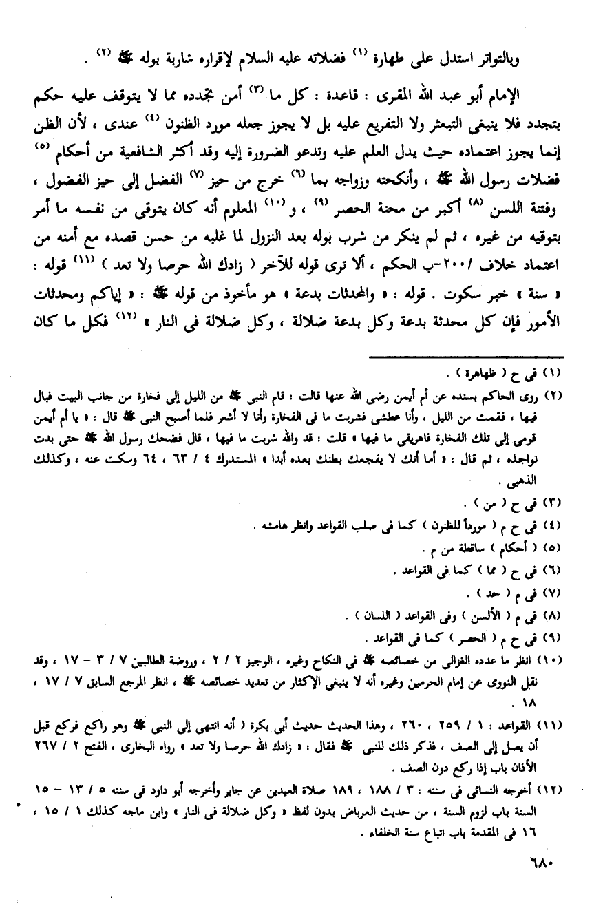 الإمام أبو عبد الله المقري: قاعدة: كل ما أمن تجدده مما لا يتوقف عليه حكم بتجدد فلا ينبغي التبعثر ولا التفريع عليه بل لا يجوز جعله مورد الظنون عندي، لأن الظن إنما يجوز اعتماده حيث يدل العلم عليه وتدعو الضرورة إليه وقد أكثر الشافعية من أحكام فضلات رسول الله عَ، وأنكحته وزواجه بما خرج من حيز الفضل إلى حيز الفضول، وفتنة اللسن أكبر من محنة الحصر، والمعلوم أنه كان يتوقى من نفسه ما أمر بتوقيه من غيره، ثم لم ينكر من شرب بوله بعد النزول لما غلبه من حسن قصده مع أمنه من اعتماد خلاف/ 200 - ب الحكم، ألا تري قوله للآخر (زادك الله حرصا ولا تعد) قوله: "سنة" خبر سكوت. قوله: "والمحدثات بدعة" هو مأخوذ من قوله صلى الله عليه وسلم: "إياكم ومحدثات الأمور فإن كل محدثة بدعة وكل بدعة ضلالة، وكل ضلالة في النار" فكل ما كان