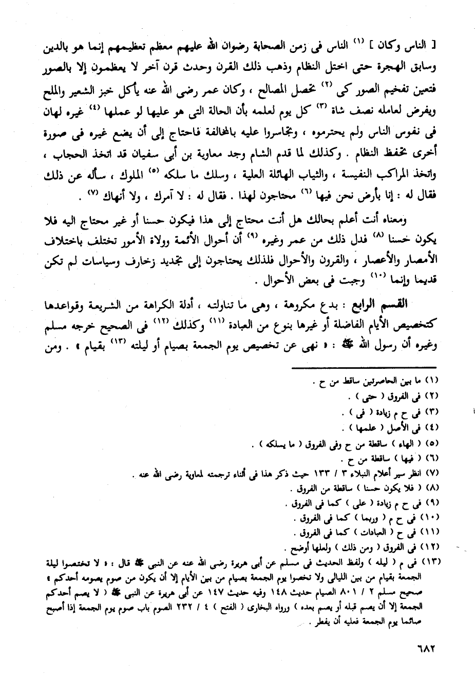 القسم الرابع: بدع مكروهة، وهى ما تناولته، أدلة الكراهة من الشريعة وقواعدها كتخصيص الأيام الفاضلة أو غيرها بنوع من العبادة وكذلك في الصحيح خرجه مسلم وغيره أن رسول الله صلى الله عليه وسلم: "نهى عن تخصيص يوم الجمعة بصيام أو ليلته بقيام". ومن