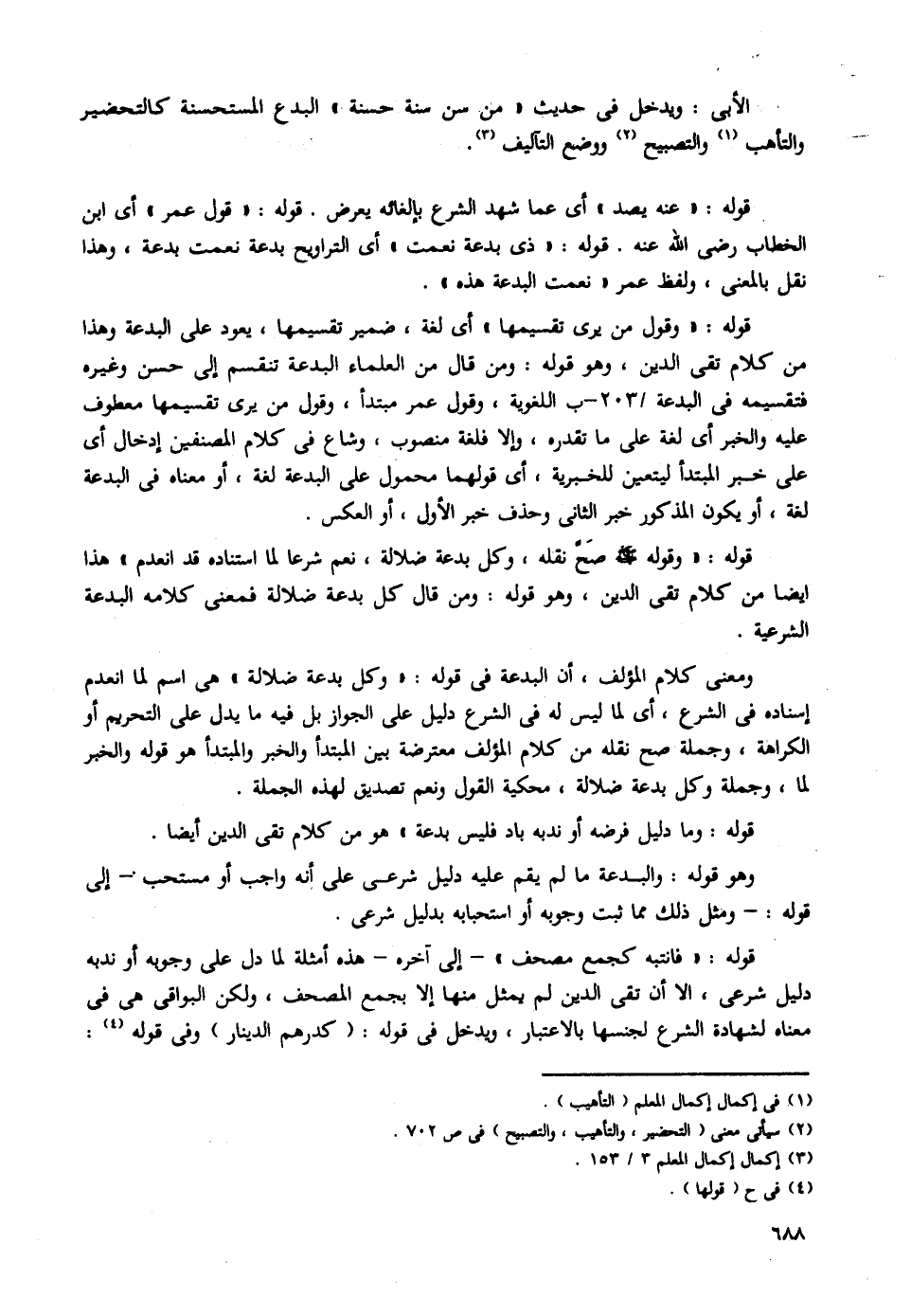 قوله: "وقوله صلى الله عليه وسلم صح نقله، وكل بدعة ضلالة، نعم شرعا لما استناده قد انعدم، هذا أيضا من كلام تقي الدين، وهو قوله: ومن قال كل بدعة ضلالة فمعني كلامه البدعة الشرعية.
