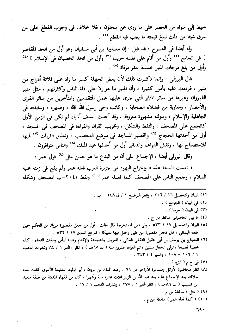 قال البرزلي: وإنما ذكرت ذلك لأن بعض الجهلة كسر ما زاد على ثلاثة أدراج من منبر، فرددت عليه بأمور كثيرة، وأن المنبر ما هو إلا على قلة الناس وكثرتهم، مثل منبر القيروان وغيرها من سائر المنابر التي جرى عليها عمل المتقدمين والمتأخرين من سائر القرى والأمصار، ومعاوية من فضلاء الصحابة، وكاتب وحى رسول الله صلى الله عليه وسلم، وصهره، وسابقته في الجاهلية والإسلام، ومنزلته مشهورة معروفة، وقد أحدث السلف أشياء لم تكن في الزمن الأول كالجمع على المصحف، والنقط والشكل، وتحزيب القرآن والقراءة في المصحف في المسجد، أول من أحدثها الحجاج وتحصير المساجد في موضع التحصيب، وتعليق الثريات فيها للاستصباح بها، ونقش الدراهم والدنانير أول من أحدثها عبد الملك والناس متوافرون.