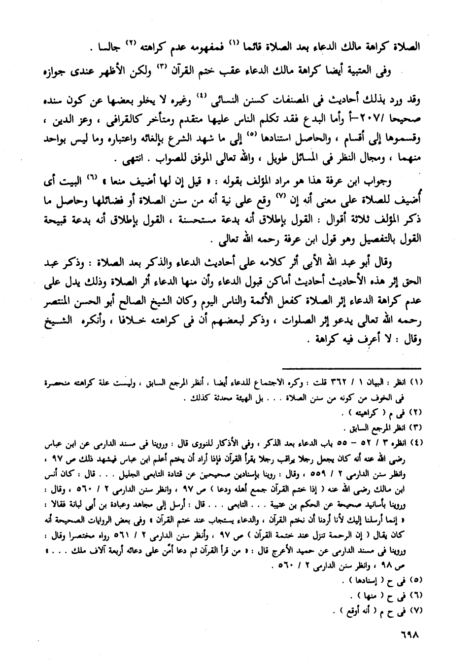 وفي العتبية أيضًا كراهة مالك الدعاء عقب ختم القرآن ولكن الأظهر عندي جوازه وقد ورد بذلك أحاديث في المصنفات كسنن النسائي وغيره لا يخلو بعضها عن كون سنده صحيحا/ 207 - أوأما البدع فقد تكلم الناس عليها متقدم ومتأخر كالقرفي، وعز الدين، وقسموها إلى أقسام، والحاصل استنادها إلى ما شهد الشرع بإلغائه واعتباره وما ليس بواحد منهما، ومجال النظر في المسائل طويل، والله تعالى الموفق للصواب. انتهى.