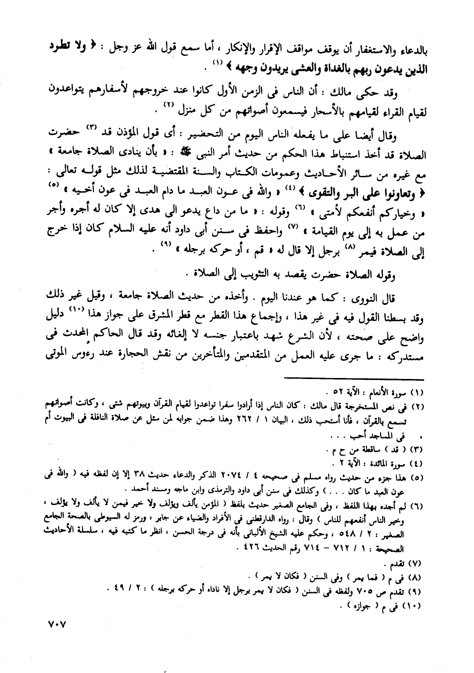 وقال أيضا على ما يفعله الناس اليوم من التحضير: أي قول المؤذن قد حضرت الصلاة قد أخذ استنباط هذا الحكم من حديث أمر النبي صلى الله عليه وسلم: "بأن ينادى الصلاة جامعة" مع غيره من سائر الأحاديث وعمومات الكتاب والسنة المقتضية لذلك مثل قوله تعالى: {وتعاونوا علي البر والتقوى} "والله في عاون العبد ما دام العبد في عون أخيه" "وخياركم أنفعكم لأمتي" وقوله: "ما من داع يدعو إلى هداي إلا كان له أجره وأجر من عمل به إلى يوم القيامة" واحفظ في سنن أبى داود أنه عليه السلام كان إذا خرج إلى الصلاة فيمر برجل إلا قال له "قم، أو حركه برجله".