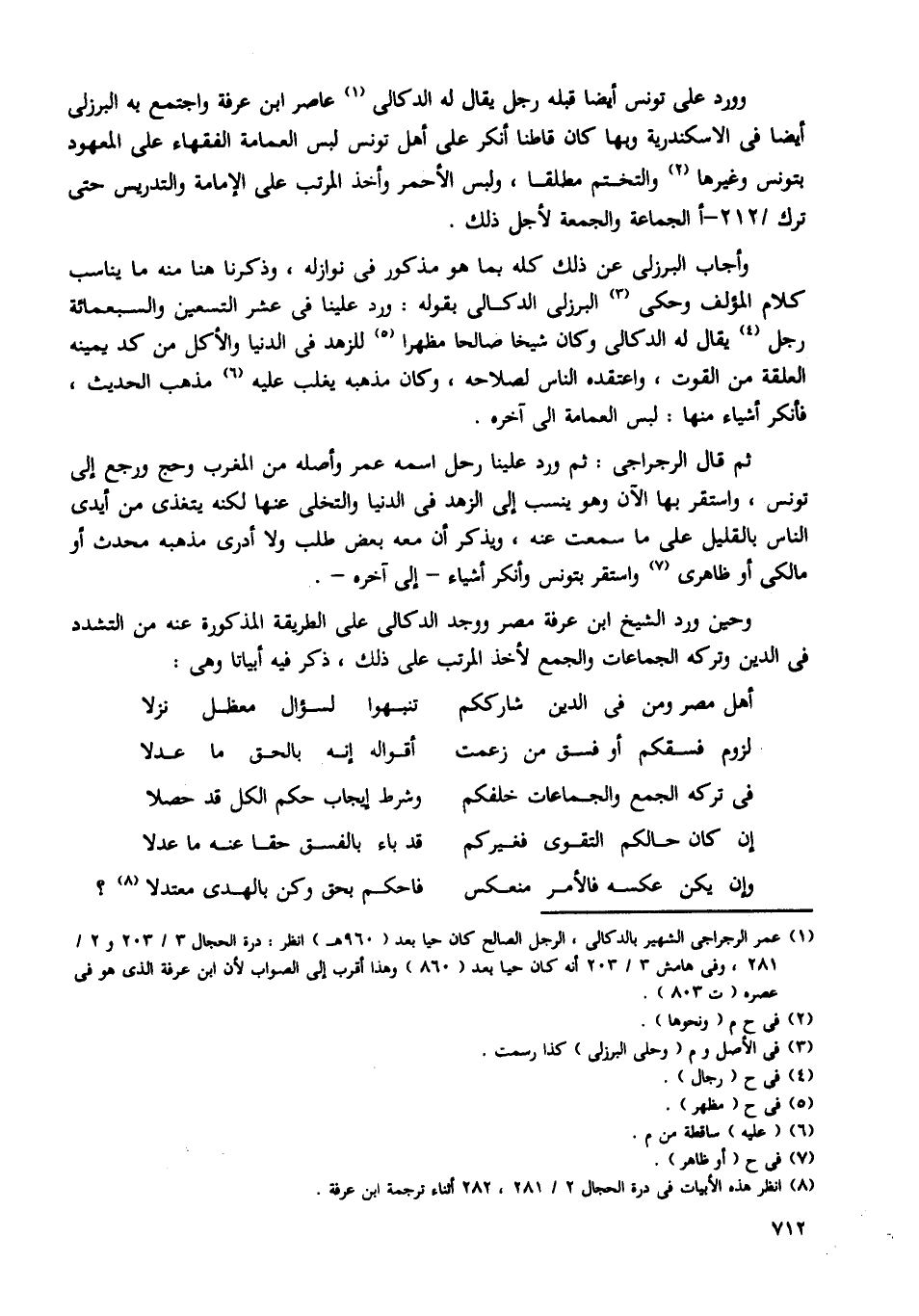 وورد على تونس أيضا قبله رجل يقال له الدكالي عاصر ابن عرفة واجتمع به البرزلي أيضا في الإسكندرية وبها كان قاطنا أنكر على أهل تونس لبس العمامة الفقهاء على المعهود بتونس وغيرها والتختم مطلقًا، ولبس الأحمر وأخذ المرتب على الإمامة والتدريس حتى ترك/ 212 - أالجماعة والجمعة لأجل ذلك.