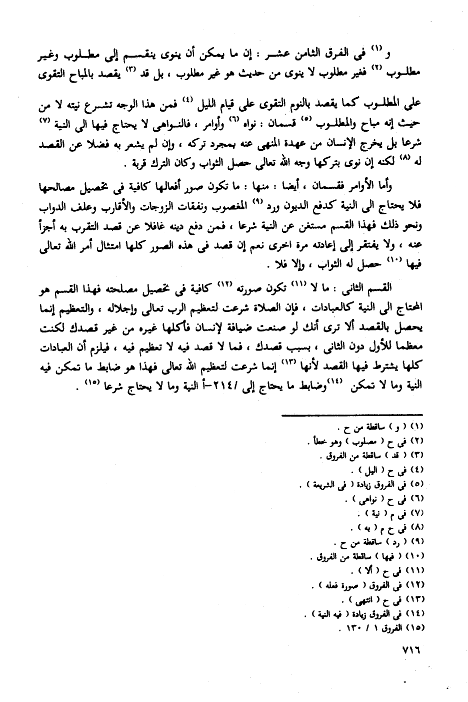 وفي الفرق الثامن عشر: إن ما يمكن أن ينوي ينقسم إلى مطلوب وغير مطلوب فغير مطلوب لا ينوي من حديث هو غير مطلوب، بل قد يقصد بالمباح التقوى على المطلوب كما يقصد بالنوم التقوى على قيام الليل فمن هذا الوجه تشرع نيته لا من حيث إنه مباح والمطلوب قسمان: نواه وأوامر، فالنواهي لا يحتاج فيها إلى النية شرعا بل يخرج الإنسان من عهدة المنهي عنه بمجرد تركه، وإن لم يشعر به فضلا عن القصد له لكنه إن نوى بتركها وجه الله تعالي حصل الثواب وكان التراث قربة.