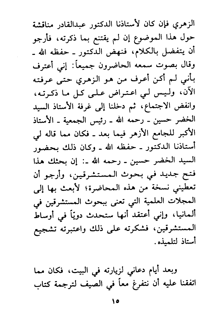 الزُهْرِي، فإنْ كان لأستاذنا الدكتور عبد القادر مناقشة حول الموضوع إنْ لم يقتنع بما ذكرته، فأرجو أن يتفضل بالكلام، فنهض الدكتور - حَفِظَهُ اللهُ -، وقال بصوت سمعه الحاضرون جميعاً: إني أعترف بأني لم أكن أعرف من هو الزُهْرِي حتى عرفته الآن، وليس لي اعتراض على كل ما ذكرته، وانفضَّ الاجتماع، ثم دخلنا غرفة الأستاذ السيد محمد الخضر حسين - رَحِمَهُ اللهُ - رئيس الجمعية الأستاذ الأكبر للجامع الأزهر فيما بعد - فكان مِمَّا قاله أستاذنا الدكتور - حَفِظَهُ اللهُ -، - وكان ذلك بحضور السيد الخضر حسين - رَحِمَهُ اللهُ -: إنَّ بحثك هذا فتح جديد في بحوث المُسْتَشْرِقِينَ، وأرجو أنْ تعطيني نسخة من هذه المحاضرة لأبعث بها إلى المجلاَّت العلميَّة التي تُعْنَى ببحوث المُسْتَشْرِقِينَ في ألمانيا، وإني أعتقد أنها ستحدث دَوِيًّا في أوساط المُسْتَشْرِقِينَ، فشكرته على ذلك واعتبرته تشجيع أستاذٍ لتلميذه.