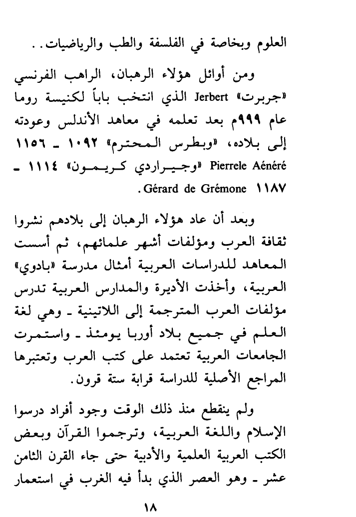 ومن أوائل هؤلاء الرُهبان، الراهب الفرنسي «جربرت» Jerbert الذي انتخب بَابَا لكنيسة روما عام 999 م بعد تعلُّمه في معاهد الأندلس وعودته إلى بلاده، و «بطرس المحترم» 1092 - 1156 Pierre Aénéré و «جيرار دي كريمون» 1114 - 1187 Gérard de Grémone .