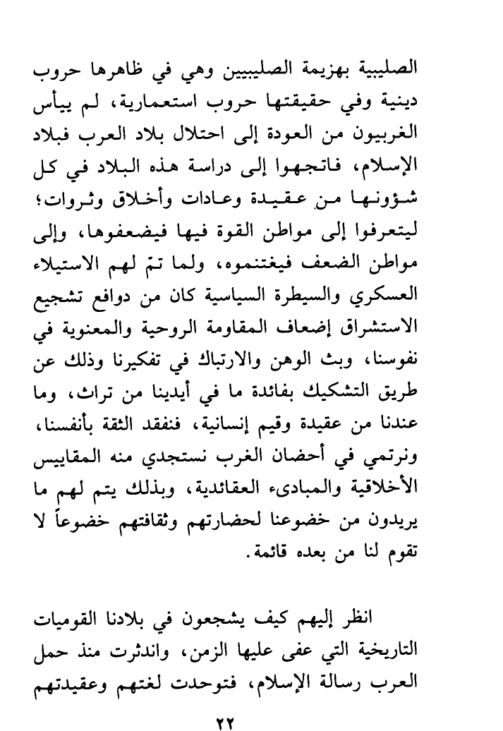 الصليبية بهزيمة الصليبيِّين وهي في ظاهرها حروب دينية وفي حقيقتها حروب استعمارية، لم ييأس الغَرْبِيُّونَ من العودة إلى احتلال بلاد العرب فبلاد الإسلام، فاتَّجهوا إلى دراسة هذه البلاد في كل شؤونها من عقيدة وعادات وأخلاق وثروات؛ ليتعرَّفوا إلى مواطن القوة فيها فيضعفوها، وإلى مواطن الضعف فيغتنموه، ولما تمَّ لهم الاستيلاء العسكري والسيطرة السياسية كان من دوافع تشجيع الاستشراق إضعاف المقاومة الروحية والمعنوية في نفوسنا، وبث الوهن والارتباك في تفكيرنا وذلك عن طريق التشكيك بفائدة ما في أيدينا من تراث، وما عندنا من عقيدة وقِيَمٍ إنسانية، فنفقد الثقة بأنفسنا، ونرتمي في أحضان الغرب نستجدي منه المقاييس الأخلاقية والمبادئ العقائدية، وبذلك يتم لهم ما يريدون من خضوعنا لحضارتهم وثقافتهم خضوعاً لا تقوم لنا من بعده قائمة.
