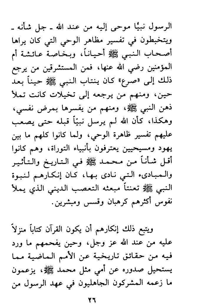الرسول نبيًّا موحى إليه من عند الله - جَلَّ شَأْنُهُ - ويتخبَّطون في تفسير مظاهر الوحي التي كان يراها أصحاب النبي - صَلََّى اللهُ عَلَيْهِ وَسَلَّمَ - أحياناً، وبخاصة عائشة أم المؤمنين - رَضِيَ اللهُ عَنْهَا -، فمن المُسْتَشْرِقِينَ من يرجع ذلك إلى «صَرْعٍ» كان ينتاب النبي - صَلََّى اللهُ عَلَيْهِ وَسَلَّمَ - حيناً بعد حين، ومنهم من يرجعه إلى تخيُّلات كانت تملأ ذهن النبي - صَلََّى اللهُ عَلَيْهِ وَسَلَّمَ -، ومنهم من يُفَسِّرُها بمرض نفسي، وهكذا، كأنَّ الله لم يرسل نبيًّا قبله حتى يصعب عليهم تفسير ظاهرة الوحي، ولما كانوا كلهم ما بين يهود ومسيحيِّين يعترفون بأنبياء التوراة، وهم كانوا أقل شأناً من محمد - صَلََّى اللهُ عَلَيْهِ وَسَلَّمَ - في التاريخ والتأثير والمبادئ التي نادى بها، كان إنكارهم لنبوَّة النبي - صَلََّى اللهُ عَلَيْهِ وَسَلَّمَ - تَعَنُّتاً مبعثه التعصُّبُ الديني الذي يملأ نفوس أكثرهم كرُهبان وقسس ومُبَشِّرِين.