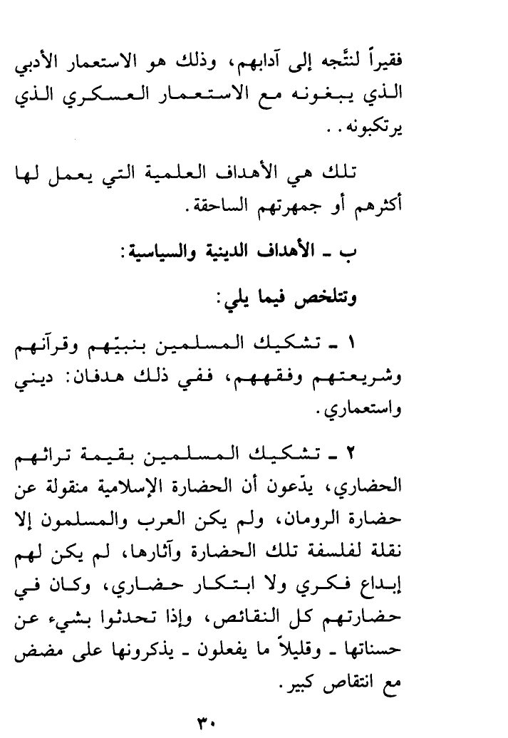1 - تشكيك المسلمين بنبيِّهم وقرآنهم وشريعتهم وفقههم، ففي ذلك هدفان: ديني واستعماري.
