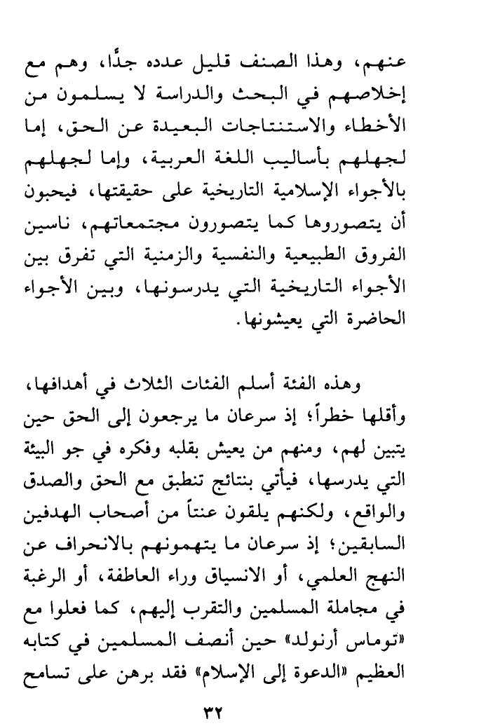 عنهم، وهذا الصنف قليل عدده جداً، وهم مع إخلاصهم في البحث والدراسة لا يسلمون من الأخطاء في البحث والاستنتاجات البعيدة عن الحق، إمّا لجهلهم بأساليب اللغة العربية، وإمَّا لجهلهم بالأجواء الإسلامية التاريخية على حقيقتها، فَيُحِبُّون أنْ يتصوَّرُوها كما يتصوَّرُون مجتمعاتهم، ناسين الفروق الطبيعية والنفسية والزمنية التي تفرِّق بين الأجواء التاريخية التي يدرسونها، وبين الأجواء الحاضرة التي يعيشونها.