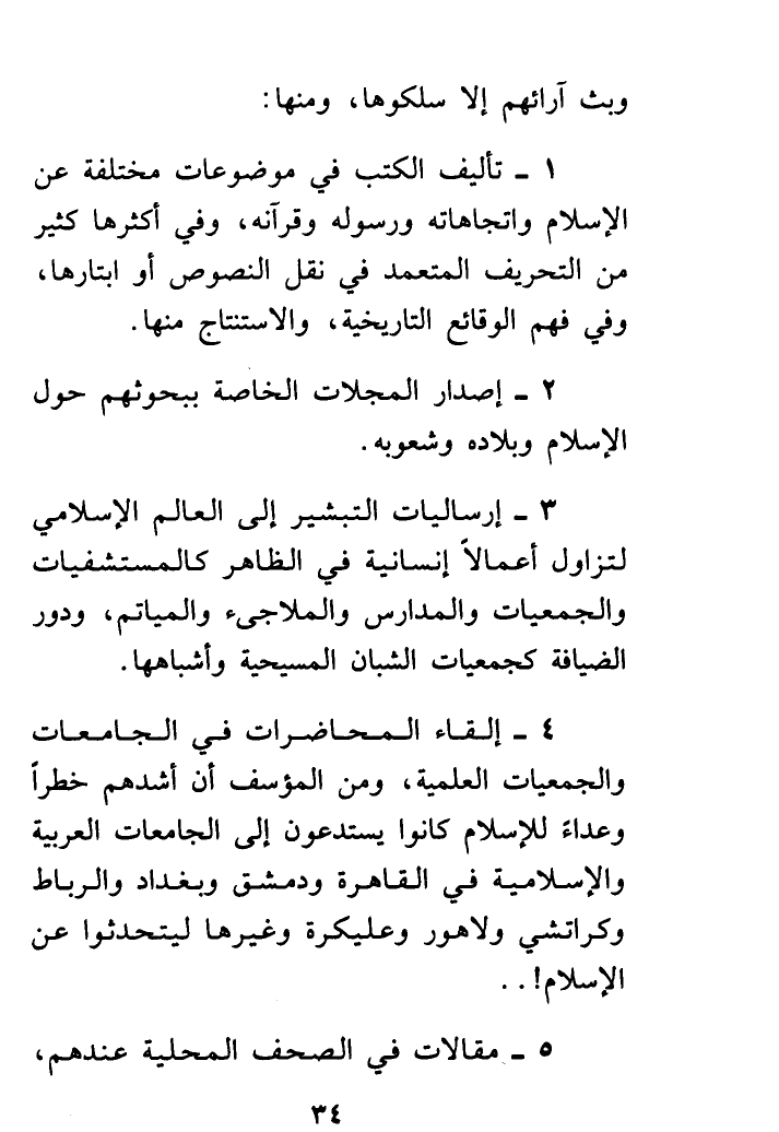 1 - تأليف الكتب في موضوعات مختلفة عن الإسلام واتجاهاته ورسوله وقرآنه، وفي أكثراه كثير من التحريف المعتمد في نقل النصوص أو ابتارها، وفي فهم الوقائع التاريخية، والاستنتاج منها.