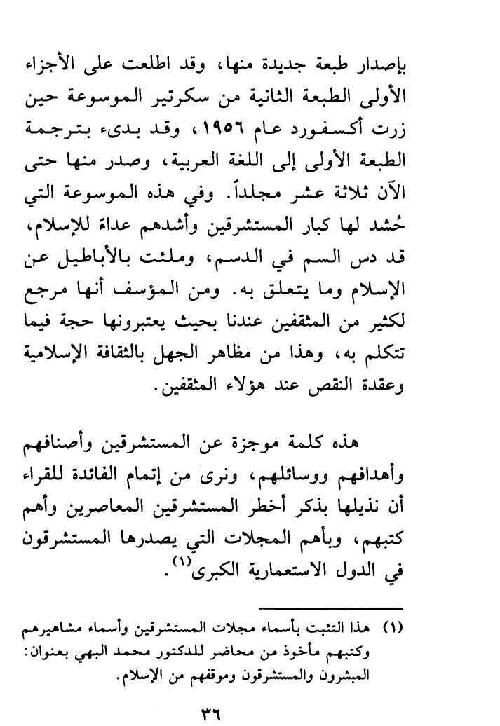 بإصدار طبعة جديدة منها، وقد اطلعت على الأجزاء الأولى للطبعة الثانية من سكرتير الموسوعة حين زُرْتُ أكسفورد عام 1956م، وقد بدئ بترجمة الطبعة الأولى إلى اللغة العربية، وصدر منها حتى الآن ثلاثة عشر مجلداً. وفي هذه الموسوعة التي حشد لها كبار المُسْتَشْرِقِينَ وأشدهم عِدَاءً للإسلام، قد دَسَّ السُمَّ في الدسم، وملئت بالأباطيل عن الإسلام وما يتعلق به. ومن المؤسف أنها مرجع لكثير من المثقَّفين عندنا بحيث بعتبرونها حُجَّةً فيما تتكلم به، وهذا من مظاهر الجهل بالثقافة الإسلامية وعقدة النقص عند هؤلاء المثقَّفين.